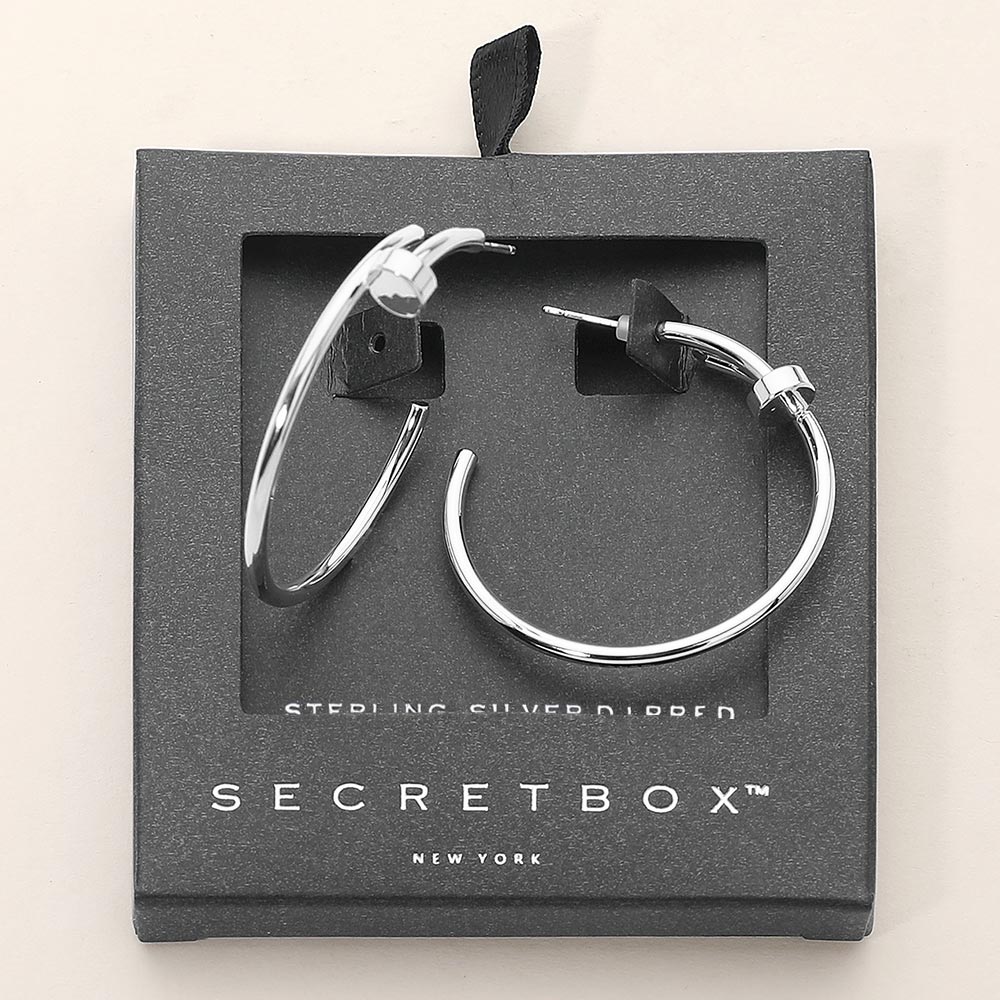 Details • Size : 1.5" X 1.5" • Post Back • Chic hoop earrings featuring a sleek nail head accent that adds a modern twist to any look. Lightweight and effortlessly stylish, they’re perfect for daily wear or gifting. A versatile accessory that elevates casual and dressy outfits with refined charm. • Sterling Silver Dipped