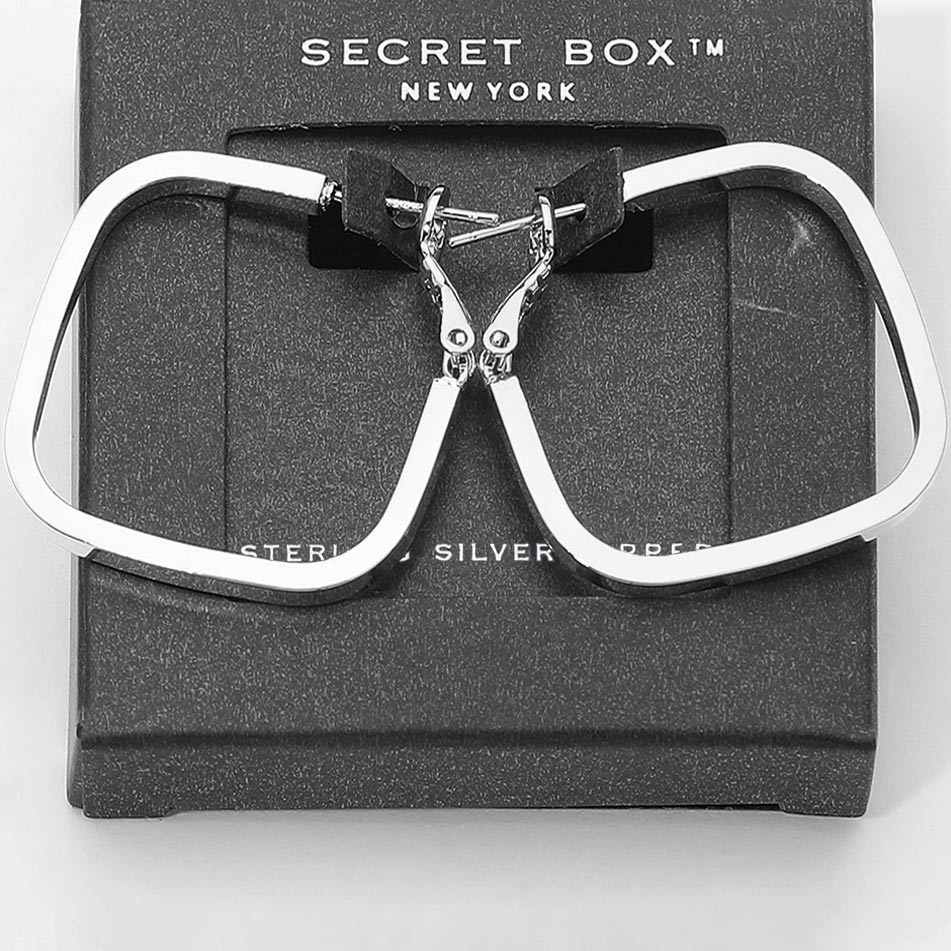 Details • Size : 1.25" X 1.25" • Omega Back • Make a bold statement with these modern geometric hoop earrings featuring a sleek square design. Lightweight yet eye-catching, they add a contemporary touch to both casual and dressy looks. Perfect for fashion-forward styling and everyday elegance. • Sterling Silver Dipped