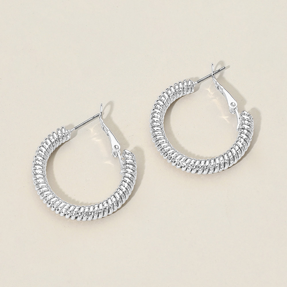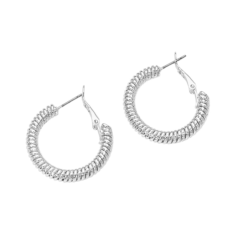 Details • Size : 1.2" X 1.2" • Omega Back • Stylish coil-texture hoop earrings featuring a bold wrapped design that adds eye-catching dimension to any outfit. Lightweight, comfortable, and perfect for both casual and dressy looks, with secure latch-back closure for easy everyday wear. • Sterling Silver Dipped • Lead and Nickel Compliant