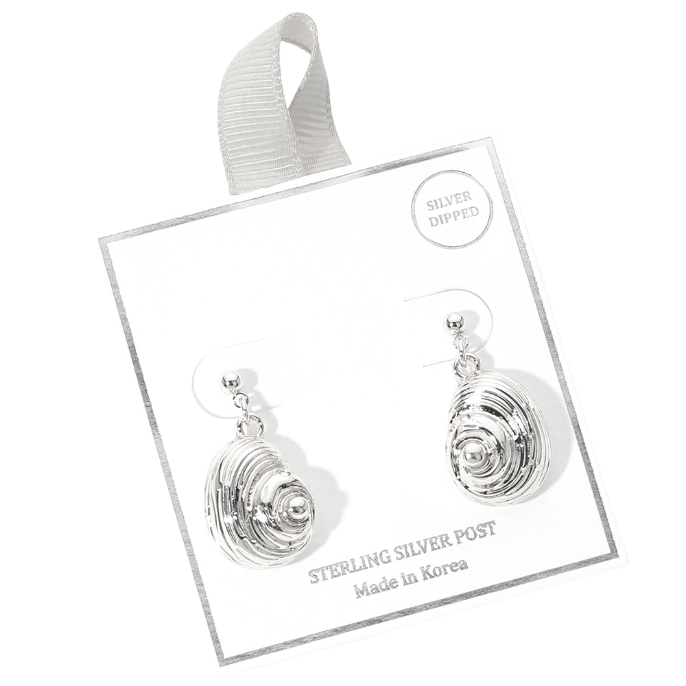 Details • Size : 0.5" X 1.1" • Seashell drop earrings featuring a textured spiral shell design and sterling silver posts. Lightweight and ocean-inspired, offering a polished coastal look for everyday wear or beach-themed outfits. • Sterling Silver Dipped • Lead and Nickel Compliant • Made In Korea • Sterling Silver Post