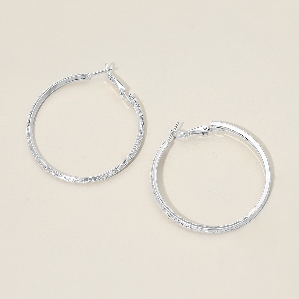 Details • Size : 2" X 2" • Omega Back • Stylish medium hoop earrings with a faceted textured finish that adds shine and dimension. Lightweight and easy to wear with secure latch backs, perfect for elevating everyday looks or adding a chic touch to dressy outfits. • Sterling Silver Dipped • Lead and Nickel Compliant