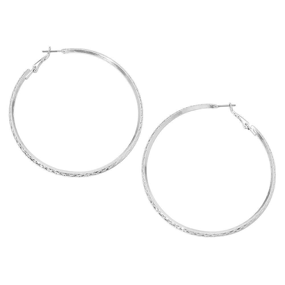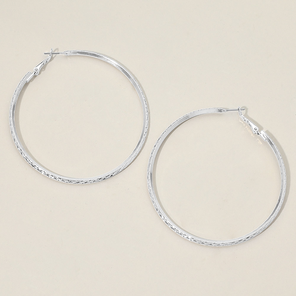 Details • Size : 2.75" X 2.75" • Omega Back • Large hoop earrings with a slim, textured round design that catches the light from every angle. Lightweight and comfortable for all-day wear, featuring secure latch backs for an effortless statement with casual or dressy outfits. • Lead and Nickel Compliant • Sterling Silver Dipped