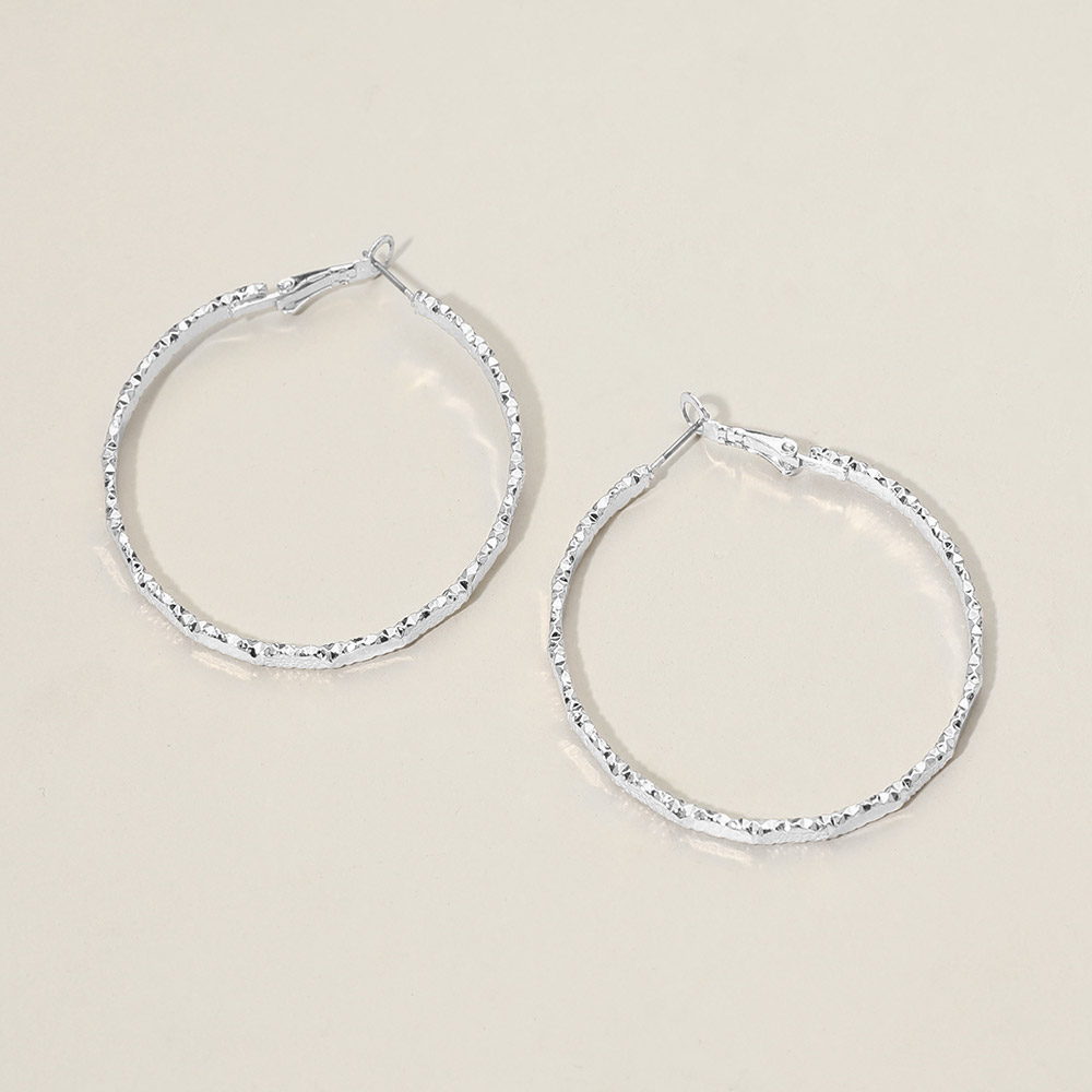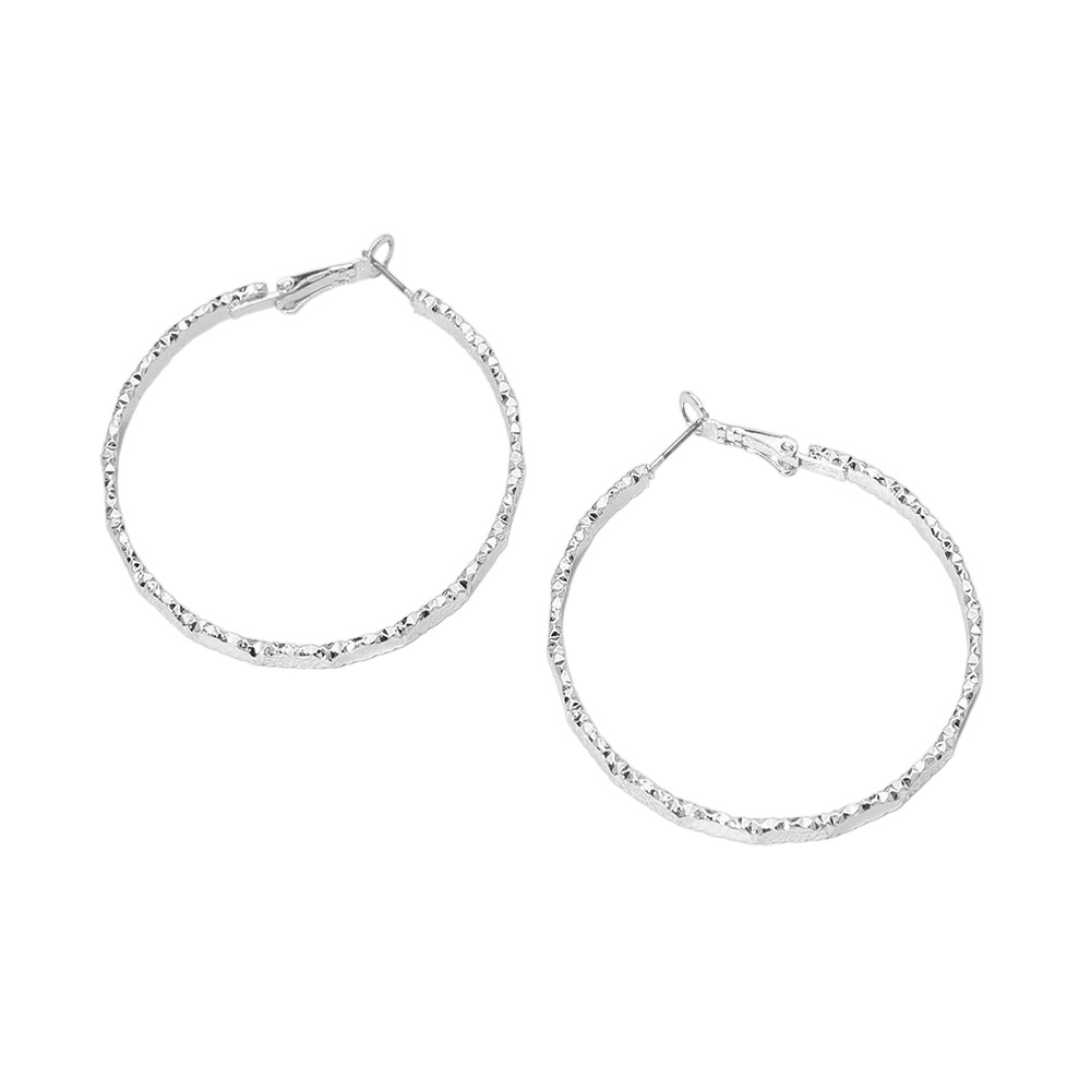 Details • Size : 2" X 2" • Omega Back • Stylish medium textured hoop earrings with a hammered-style pattern that adds shine and dimension. Lightweight and comfortable with a secure latch-back closure, perfect for daily wear or dressing up your look with a subtle touch of modern elegance. • Sterling Silver Dipped • Lead and Nickel Compliant