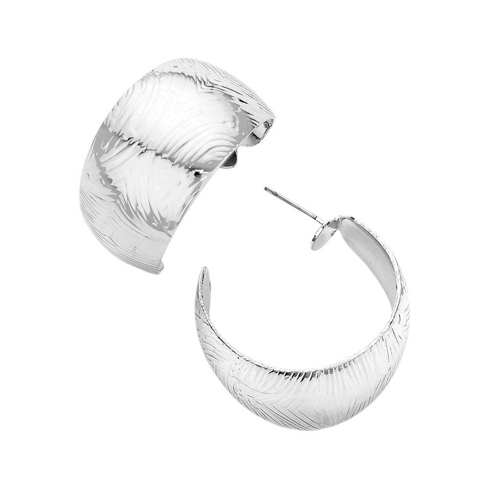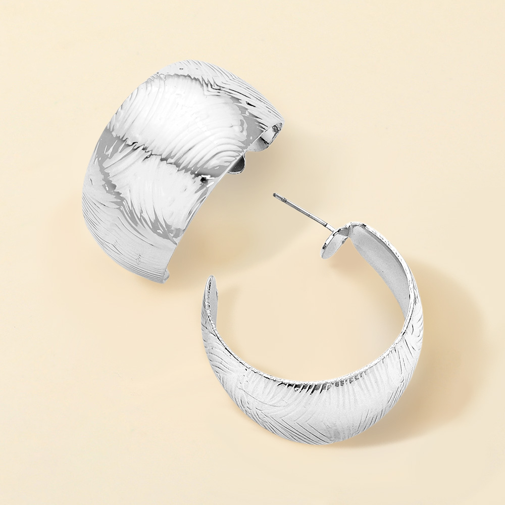 Details • Size : 1.25" X 1.25" • Post Back • Bold wide hoop earrings with a textured finish, combining modern style and timeless elegance. Lightweight and comfortable, perfect for elevating casual looks or adding a chic statement to evening wear. • Lead and Nickel Compliant • Sterling Silver Dipped