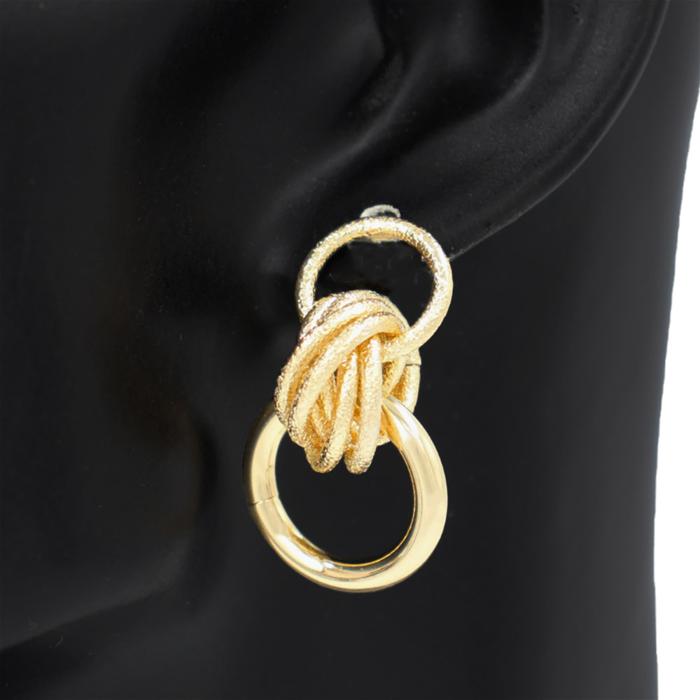 Details • Size : 0.75" X 1.4" • Post Back • Bold statement earrings featuring a textured loop, intricate knot detail, and a smooth open hoop for a modern layered look. Lightweight yet eye-catching, perfect for elevating everyday outfits or adding a stylish accent to evening and special-occasion ensembles. • Lead and Nickel Compliant