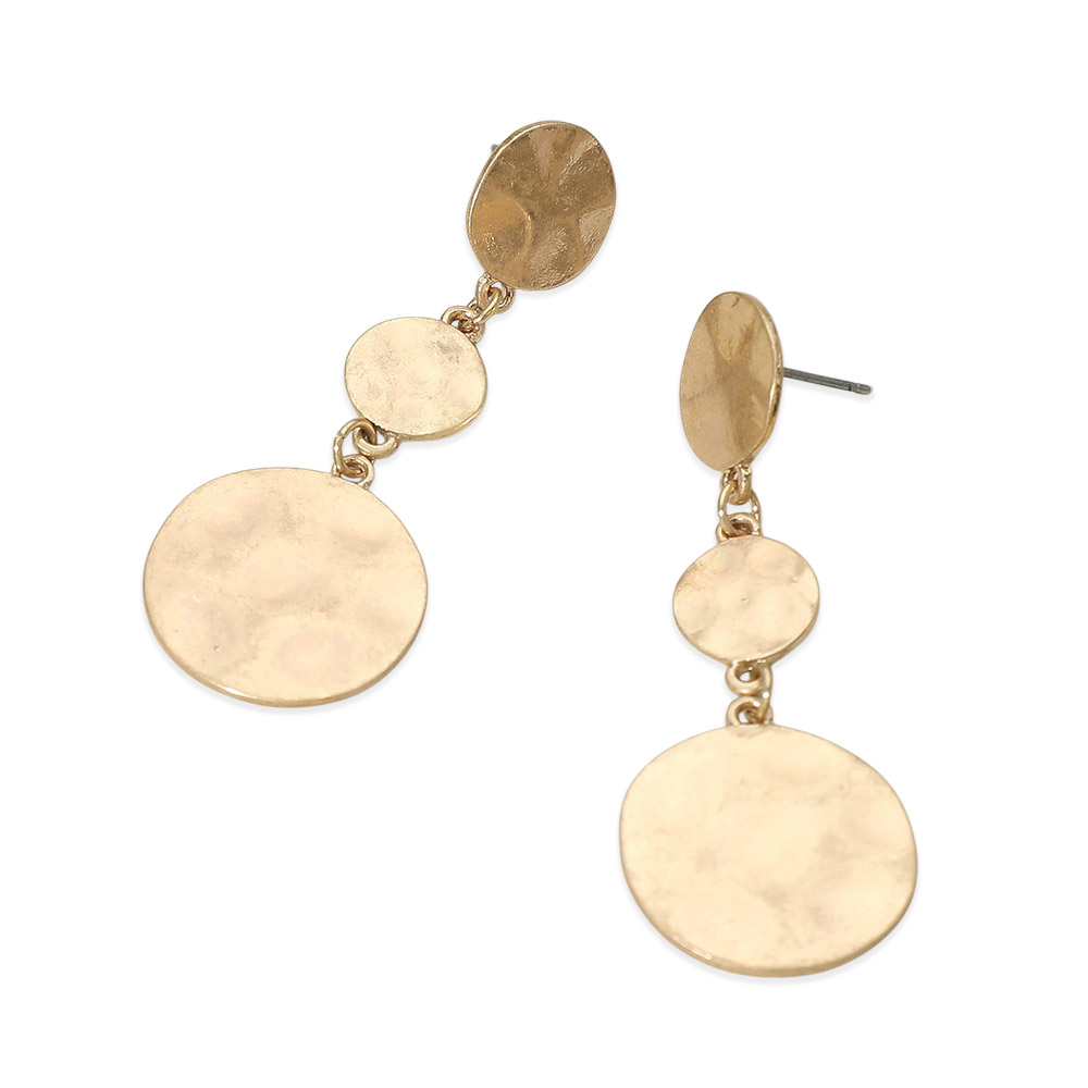 Details • Size : 0.8" X 2.25" • Post Back • Stylish drop earrings featuring layered hammered disc shapes that create organic texture and natural movement. The cascading design offers a modern yet timeless look, making these earrings easy to style with everyday outfits, workwear, or elevated occasions that call for subtle statement jewelry. • Lead and Nickel Compliant