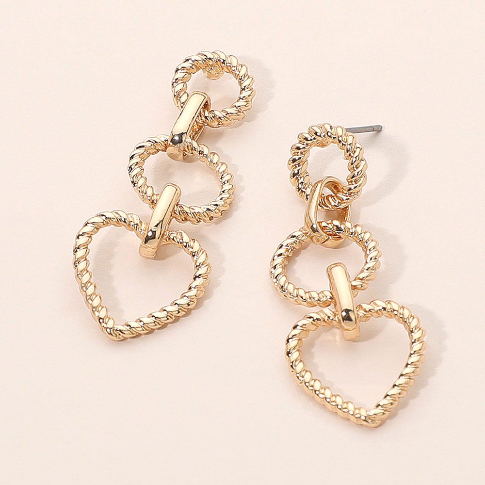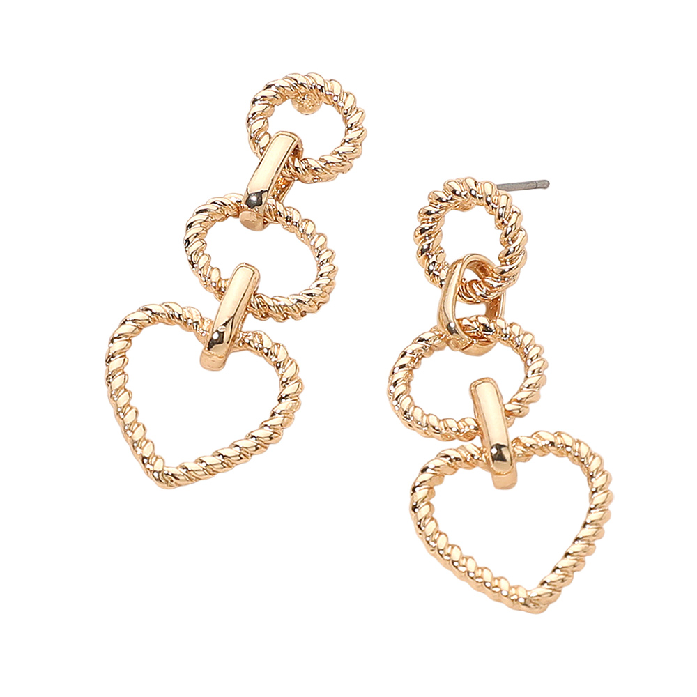 Details • Size : 0.6" X 1.75" • Post Back • Make a chic statement with these twisted heart drop earrings featuring interlinked circles and heart outlines for a refined, modern look. Lightweight and eye-catching, they bring a touch of romance and sophistication to both casual and evening ensembles. • Lead and Nickel Compliant