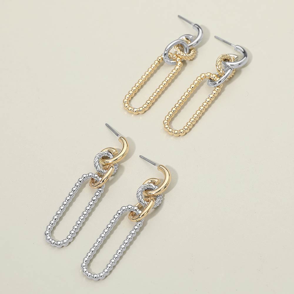 Details • Size : 0.4" X 2.2" • Post Back • Modern drop earrings designed with interlinked hoops and a beaded open drop silhouette that adds movement and dimension. A bold yet refined accessory that elevates everyday styling and pairs effortlessly with casual, work, or evening looks for versatile wear across seasons. • Lead and Nickel Compliant