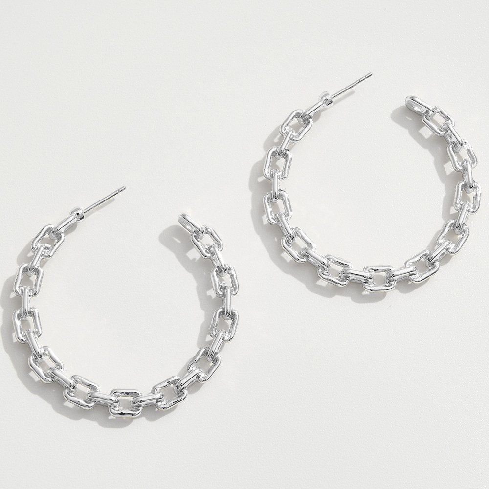 Details • Size : 1.75" X 1.75" • Post Back • Make a statement with these chain-link hoop earrings, designed with interlocking links that bring a modern edge to a classic silhouette. Their bold structure offers both strength and elegance, making them a versatile piece for everyday styling or standout looks. • Brass • Gold Dipped • Hypoallergenic • Lead and Nickel Compliant • Made In Korea