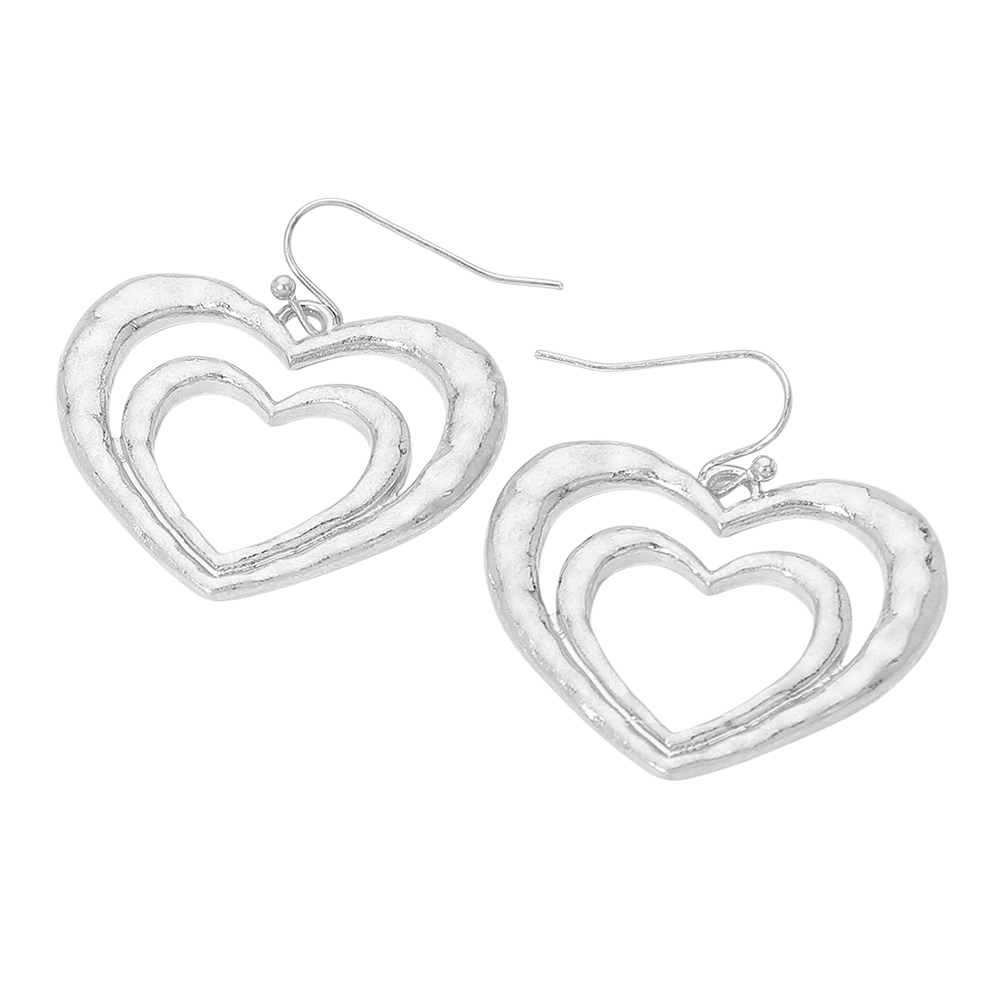 Worn Metal Hammered Double Heart Layered Drop Earrings