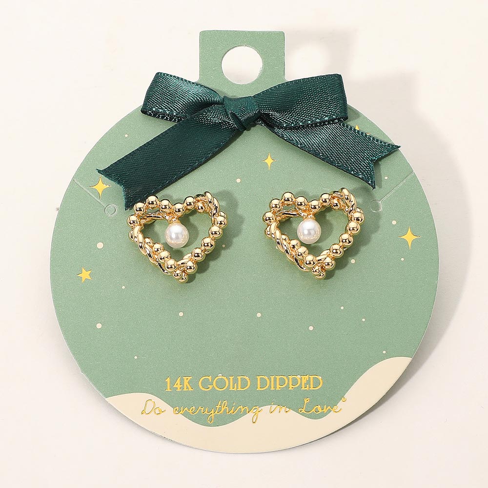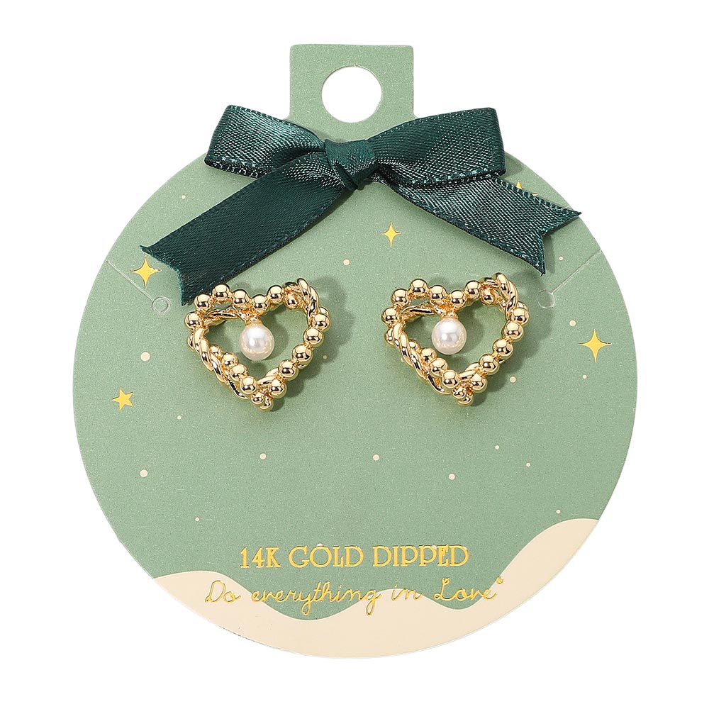 Details • Size : 0.8" X 0.7" • Post Back • Charming beaded heart pearl stud earrings featuring an open heart silhouette formed with rounded beads and a delicate pearl accent at the center. Perfect for gifting, seasonal outfits, or adding a sweet romantic touch to everyday style. A playful yet elegant accessory with timeless appeal. • Gold Dipped • Hypoallergenic • Lead and Nickel Compliant • Made In Korea