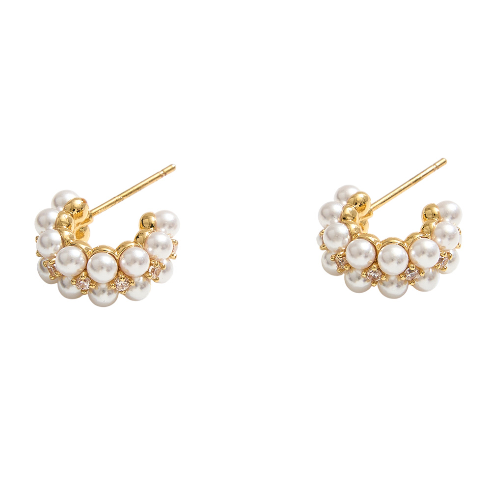 Details • Size : 0.6" X 0.5" X 0.25" • Post Back • Cluster huggie earrings adorned with luminous pearls and sparkling accents for a refined yet modern look. Their elegant design brings effortless sophistication, making them the perfect choice for elevating casual styles or completing special occasion outfits. • Brass • Gold Dipped • Hypoallergenic • Lead and Nickel Compliant • Made In Korea