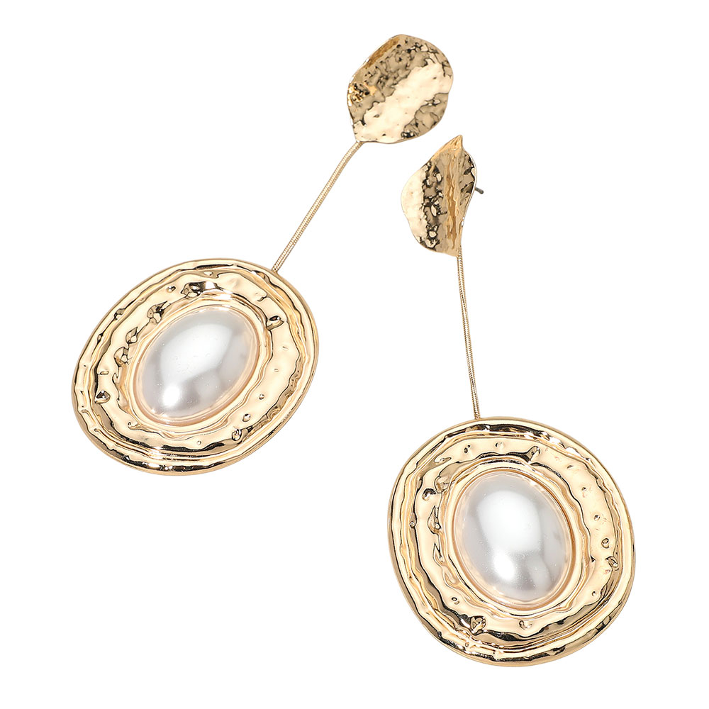 Details • Size : 1.4" X 4.8" • Post Back • Bold long drop statement earrings featuring hammered oval frames with a glossy center accent. Designed with an elegant elongated post detail, these fashion earrings add a modern artistic touch for standout, elevated styling. • Lead and Nickel Compliant