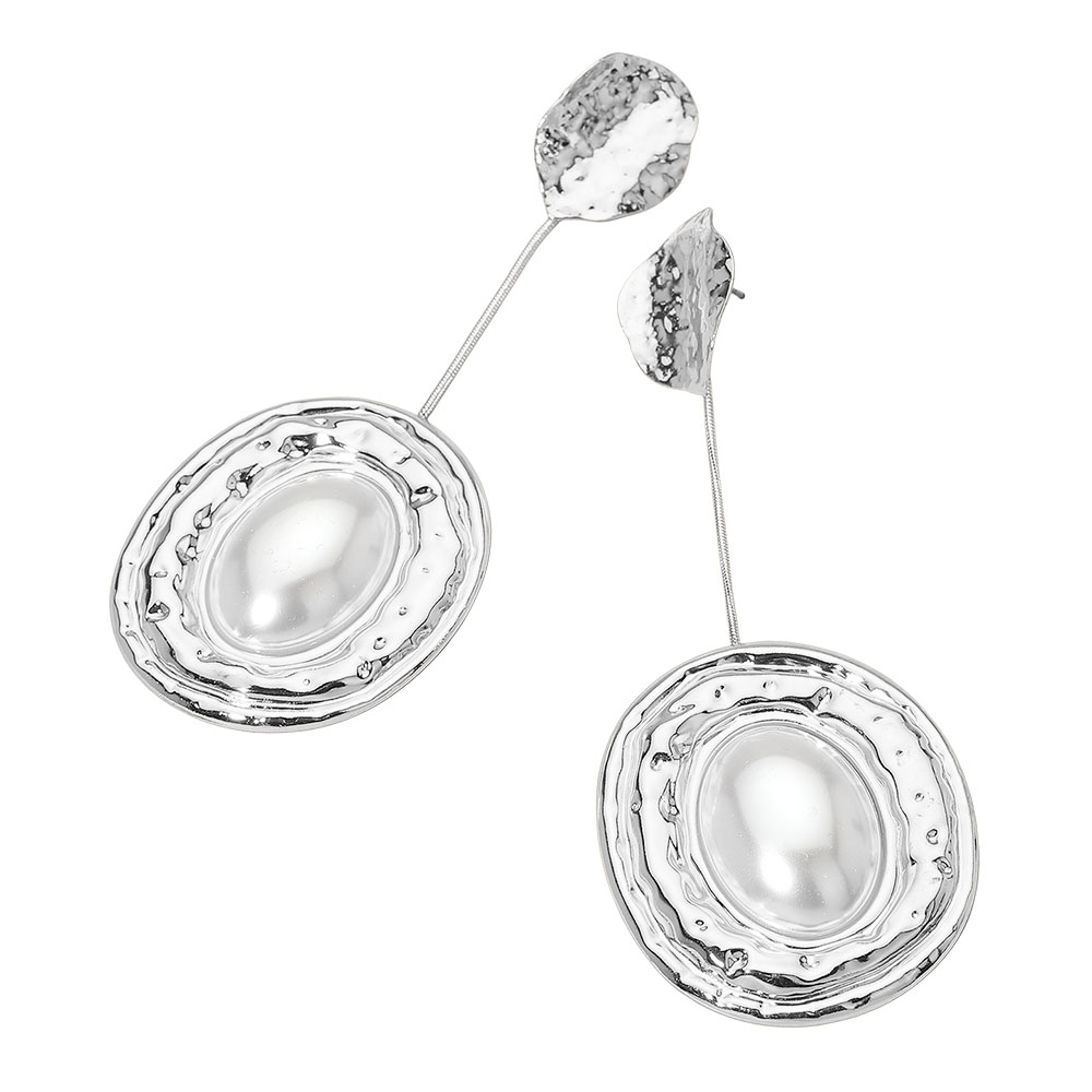 • Bold long drop statement earrings featuring hammered oval frames with a glossy center accent. Designed with an elegant elongated post detail, these fashion earrings add a modern artistic touch for standout, elevated styling.