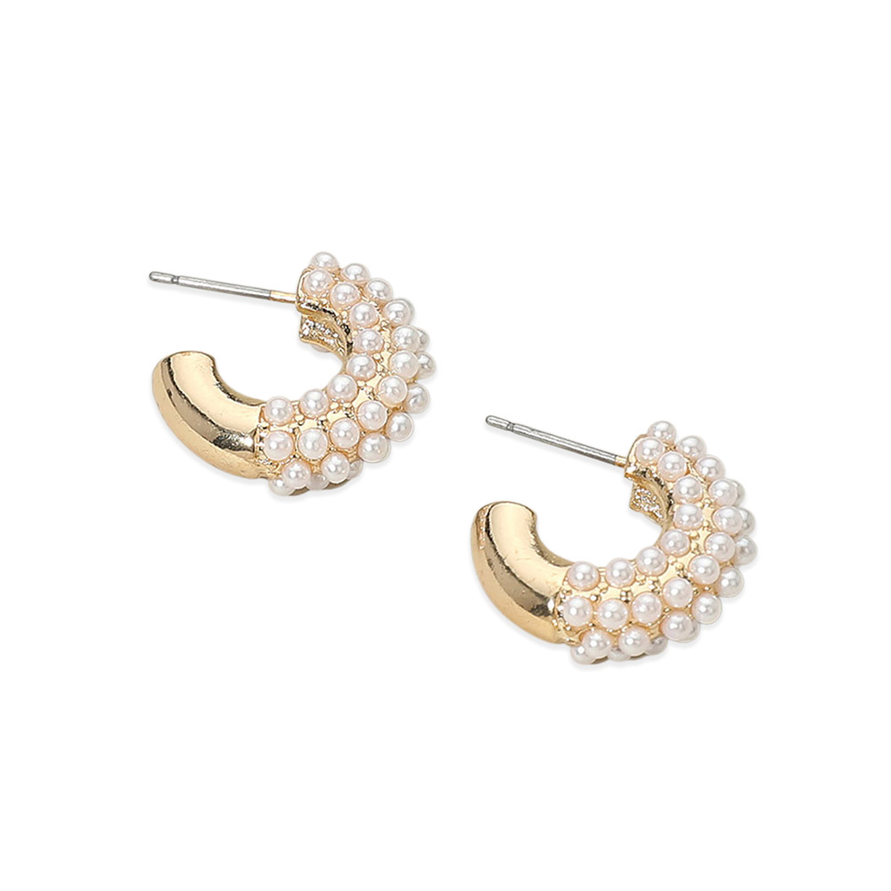 Details • Size : 0.75" X 0.75" • Post Back • Mini hoop earrings designed with layered pearl-style bead accents for a refined yet modern look. A versatile accessory that transitions effortlessly from everyday wear to special occasions, adding subtle texture, dimension, and timeless elegance to any accessory collection. • Lead and Nickel Compliant