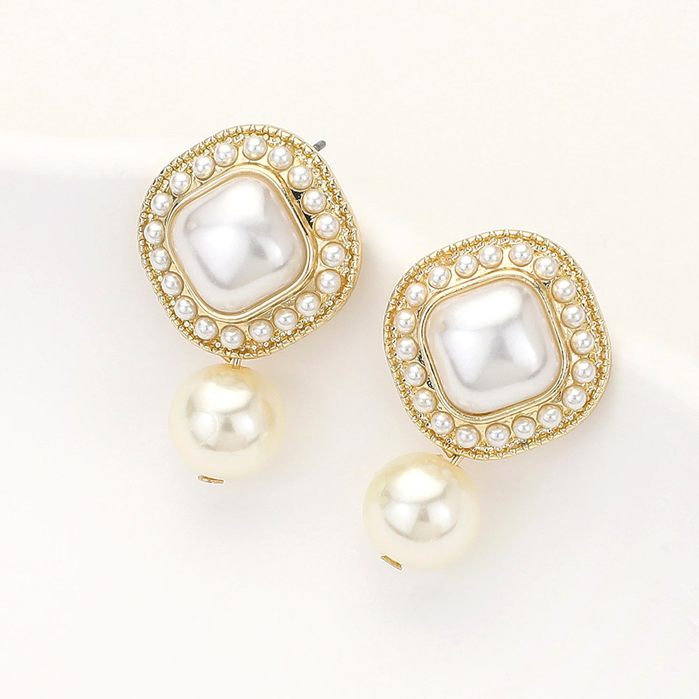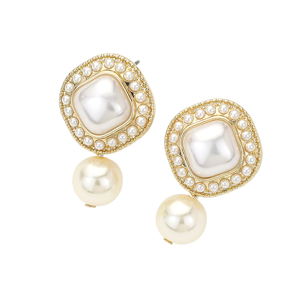 White Gold Dipped CZ Stone Paved Gingko Pearl Stud Earrings