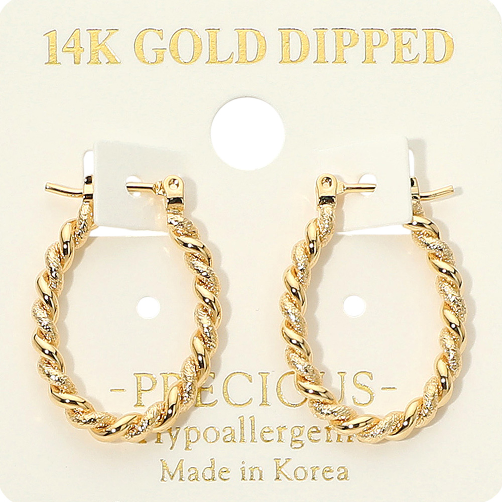 Details • Size : 0.75" X 1" • Pin Catch • These twisted hoop earrings bring refined texture and dimension to your style with their braided design and shimmering finish. Perfect for both everyday elegance and evening charm, they offer a timeless balance of sophistication and versatility for any occasion. • Gold Dipped • Hypoallergenic • Made In Korea