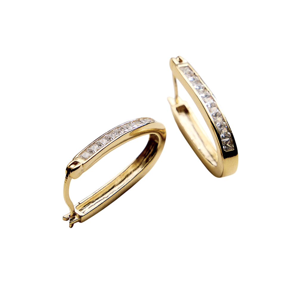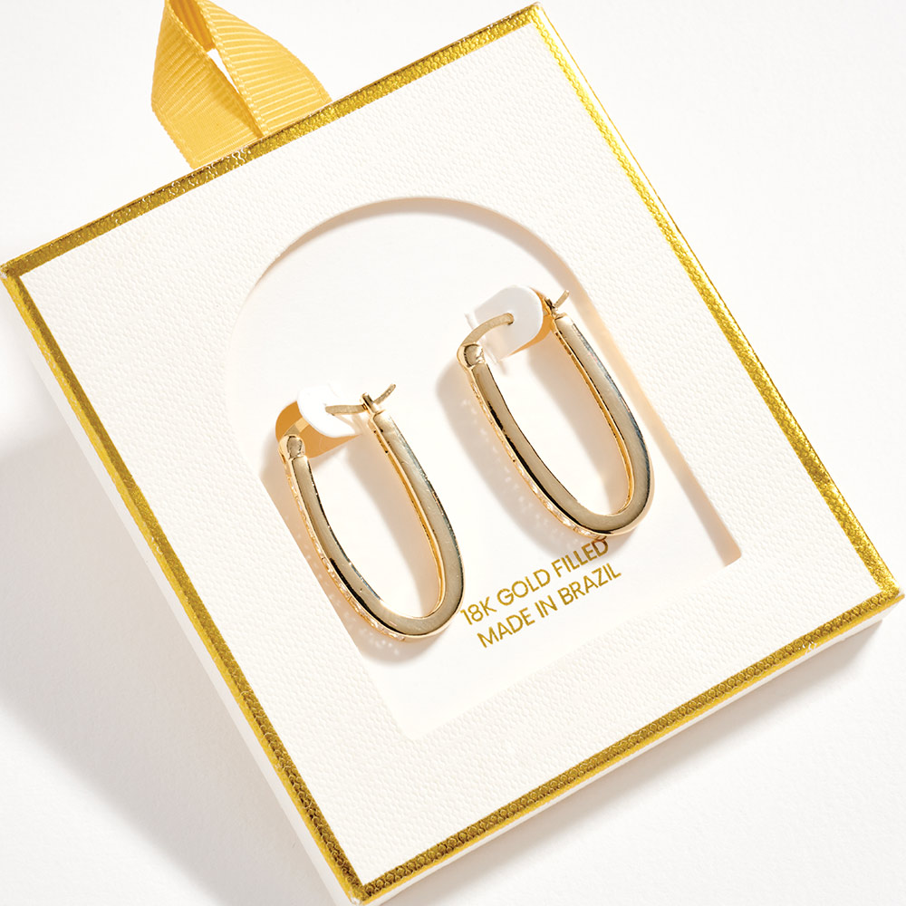 Details • Size : 0.7" X 1.2" • Pin Catch • Sleek oval hoop earrings designed with a smooth, modern silhouette that adds effortless polish to any look. Lightweight and easy to wear, they pair beautifully with casual outfits, workwear, and evening styles, making them a versatile essential for daily wear and gifting. • CZ Cubic Zirconia • Gold Filled • Hypoallergenic • Lead and Nickel Compliant • Made In Brazil