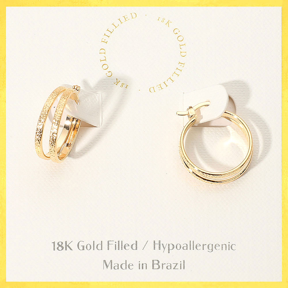 Details • Size : 0.75" X 0.8" X 0.25" • Pin Catch • These 18K gold filled triple hoop earrings feature a refined textured finish that adds depth and brilliance to any outfit. Designed to be hypoallergenic for all-day comfort, they combine timeless sophistication with a modern twist. Beautifully made in Brazil for everyday elegance. • Gold Filled • Hypoallergenic • Lead and Nickel Compliant • Made In Brazil
