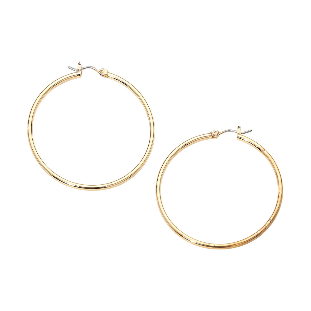 Details • Size : 2" X 2" • Pin Catch • Sleek thin hoop earrings designed with a smooth, lightweight finish for effortless everyday wear. Their clean, minimalist style pairs with any outfit, making them a timeless accessory for casual looks, work attire, or evening outfits. Perfect for adding simple, elegant flair to any jewelry collection. • Lead and Nickel Compliant • Gold Dipped