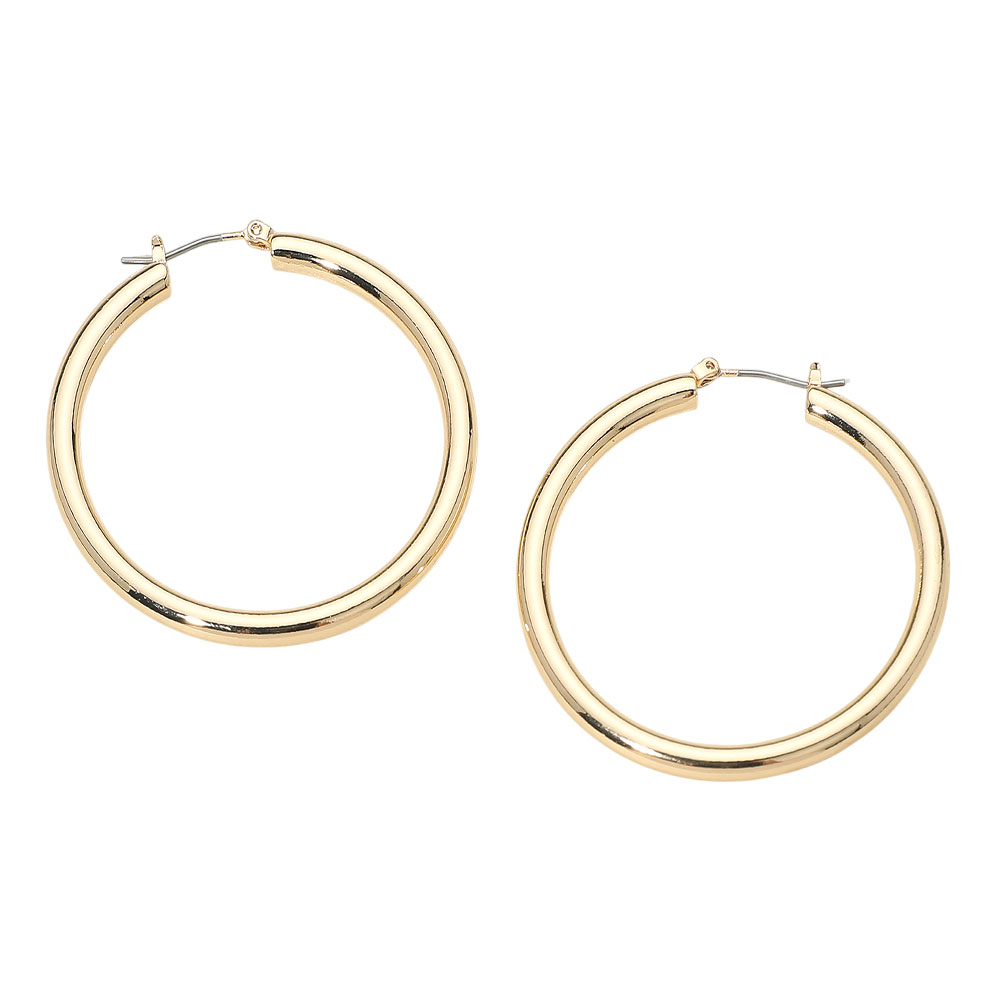 Details • Size : 2" X 2" • Pin Catch • Bold thick hoop earrings featuring a smooth, polished round design that adds a modern statement to any look. Lightweight and comfortable for all-day wear, these timeless hoops complement casual outfits, work attire, and dressy styles, making them a versatile must-have accessory. • Lead and Nickel Compliant • Gold Dipped