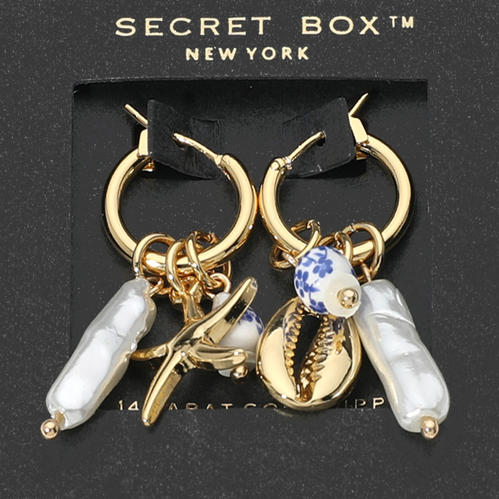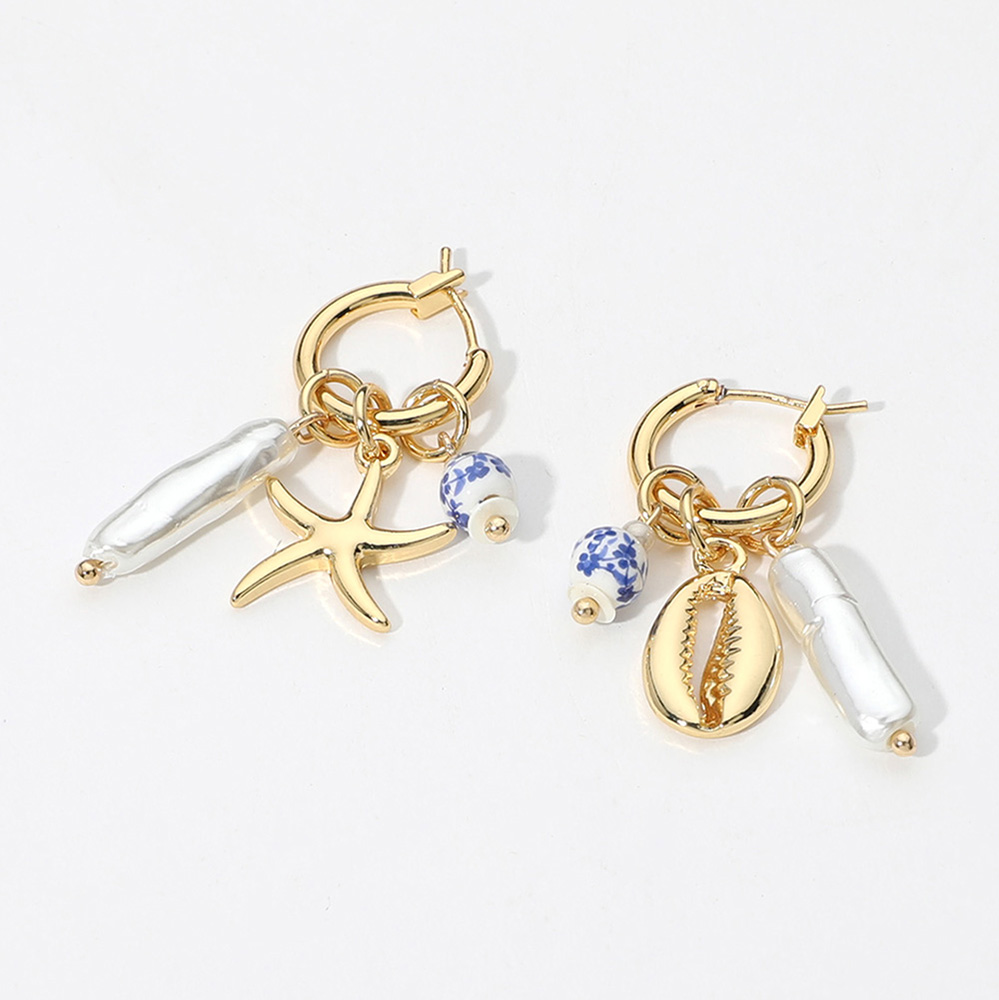 SECRET BOX_14K Gold Dipped Pearl Starfish Puka Shell Ceramic Ball Dangle Pin Catch Hoop Earrings