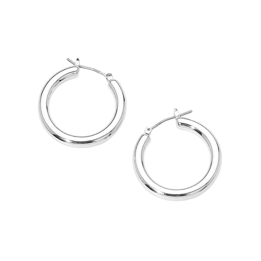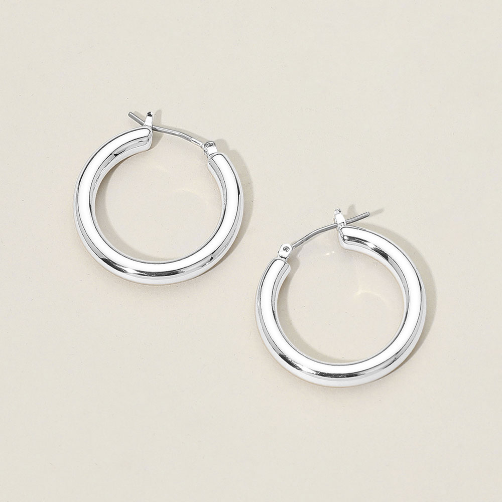 Details • Size : 1.2" X 1.2" • Pin Catch • Timeless thick round hoop earrings featuring a smooth, polished finish that adds a bold yet versatile touch to any style. Lightweight and easy to wear for daily outfits or special occasions, these essential hoops offer a modern, minimal design that complements every look effortlessly. • Sterling Silver Dipped • Lead and Nickel Compliant