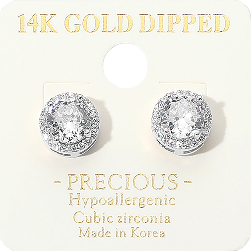 Details • Size : 0.3" X 0.3" • Post Back • These elegant stud earrings feature brilliant round cubic zirconia stones encircled by a sparkling halo setting. Hypoallergenic and stylish, they offer timeless sophistication perfect for everyday wear or special occasions with a subtle yet radiant finish. • Lead and Nickel Compliant • Hypoallergenic • Made In Korea • Gold Dipped • CZ Cubic Zirconia
