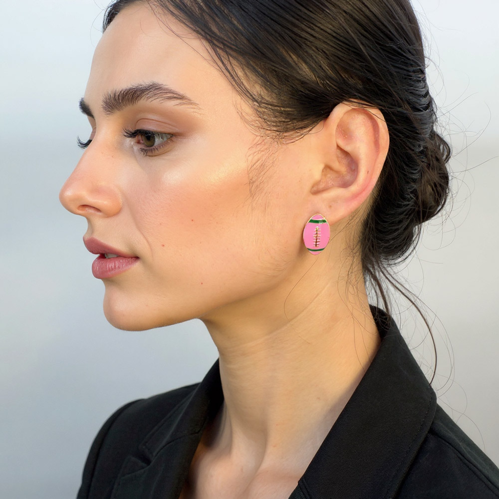 Details • Size : 0.5" X 1" • Post Back • Show your sporty side with these football shape enamel stud earrings. Featuring a sleek oval silhouette with raised stitch detailing, they combine playful design with modern style, making them the perfect accessory for game days or casual looks that stand out. • Brass • Gold Dipped • Hypoallergenic • Lead and Nickel Compliant • Made In Korea