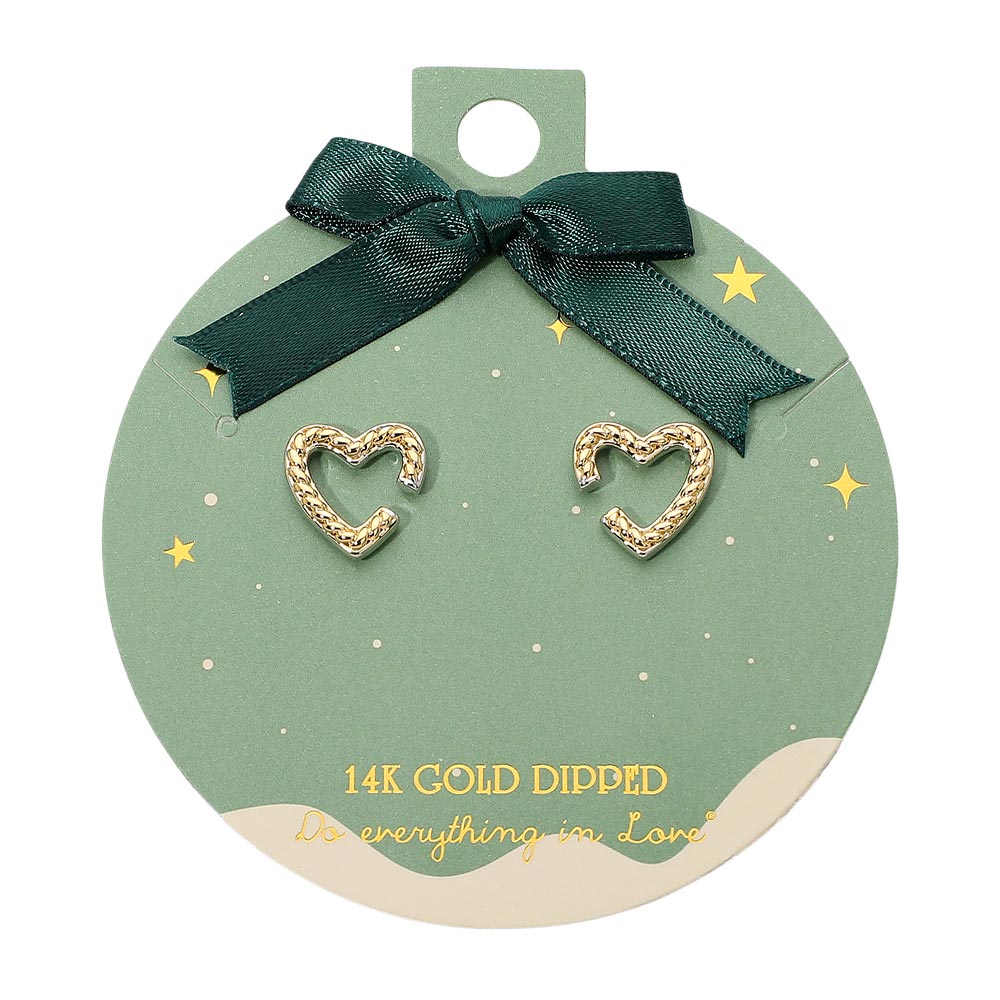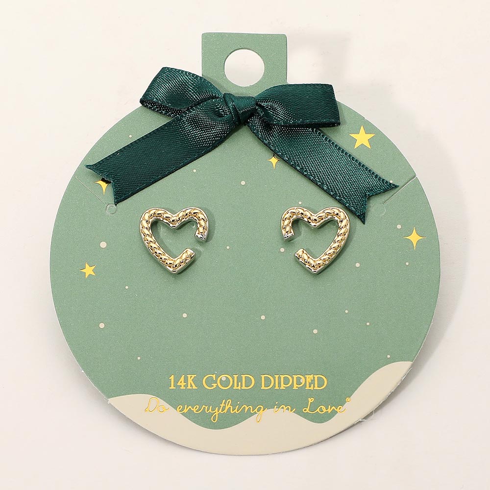 Details • Size : 0.6" X 0.6" • Post Back • Charming textured open heart stud earrings featuring a softly curved silhouette with subtle detailing. Their sweet, minimalist design makes them perfect for gifting, everyday wear, seasonal outfits, or adding a delicate romantic accent to any look. A versatile and timeless accessory. • Gold Dipped • Hypoallergenic • Lead and Nickel Compliant • Made In Korea