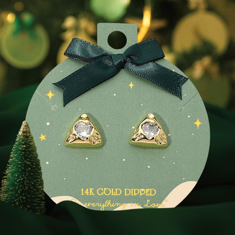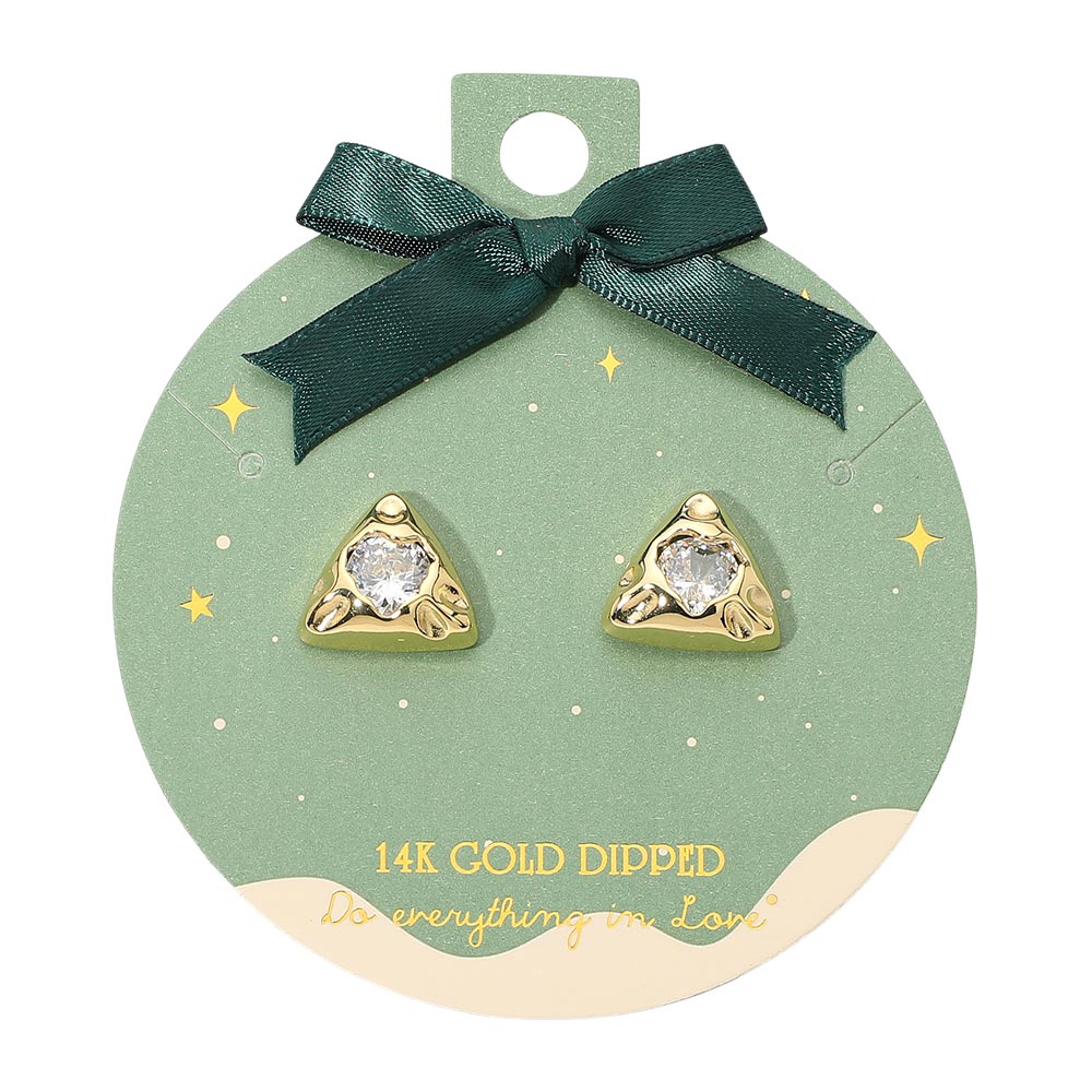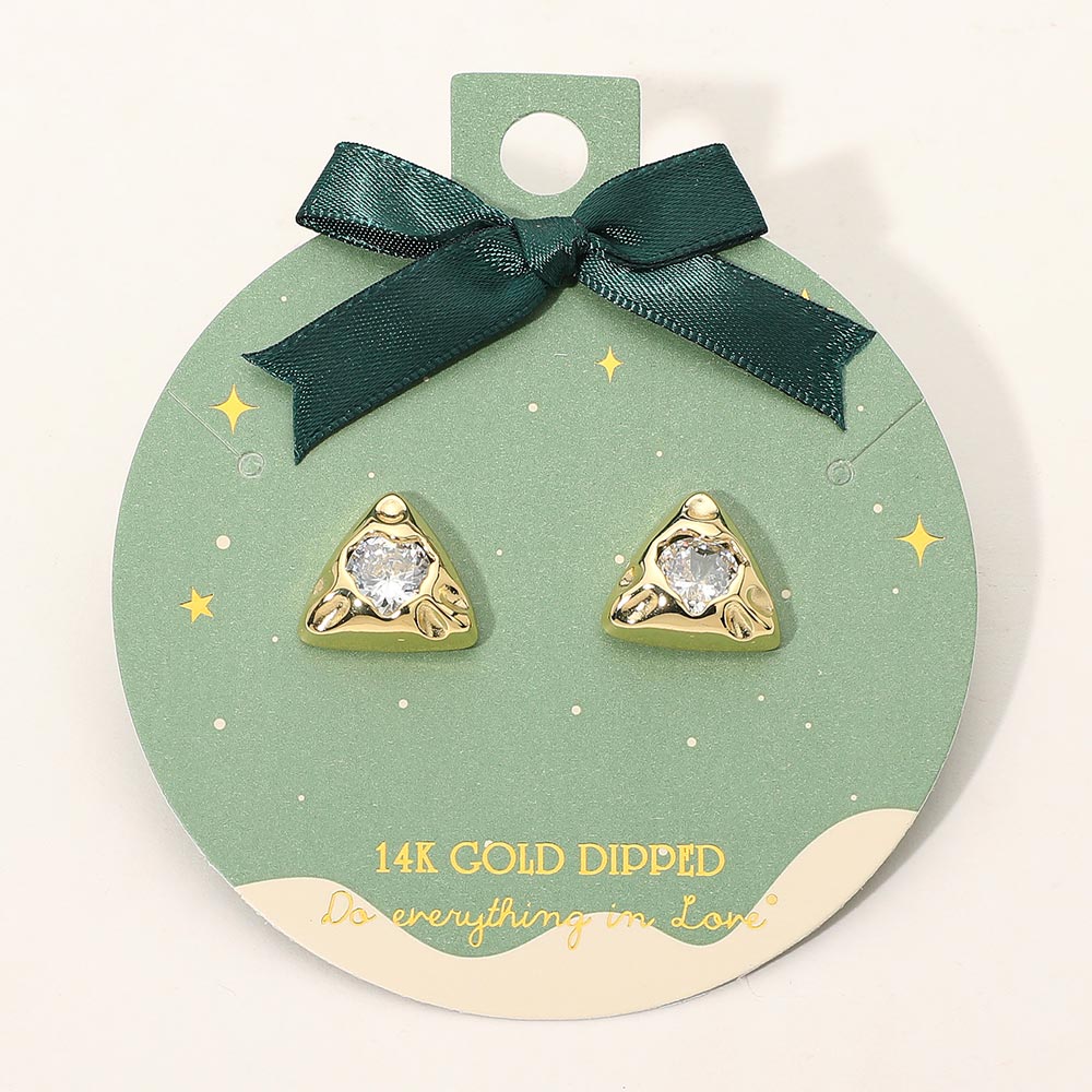 Details • Size : 0.7" X 0.6" • Post Back • Modern triangle crystal stud earrings featuring a smooth sculpted frame with a sparkling center stone. Their minimalist yet elegant design makes them perfect for everyday wear, gifting, or adding a polished touch to seasonal outfits. A versatile accessory with a chic, contemporary feel. • Gold Dipped • Hypoallergenic • Lead and Nickel Compliant • Made In Korea
