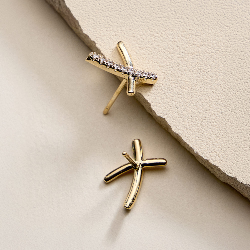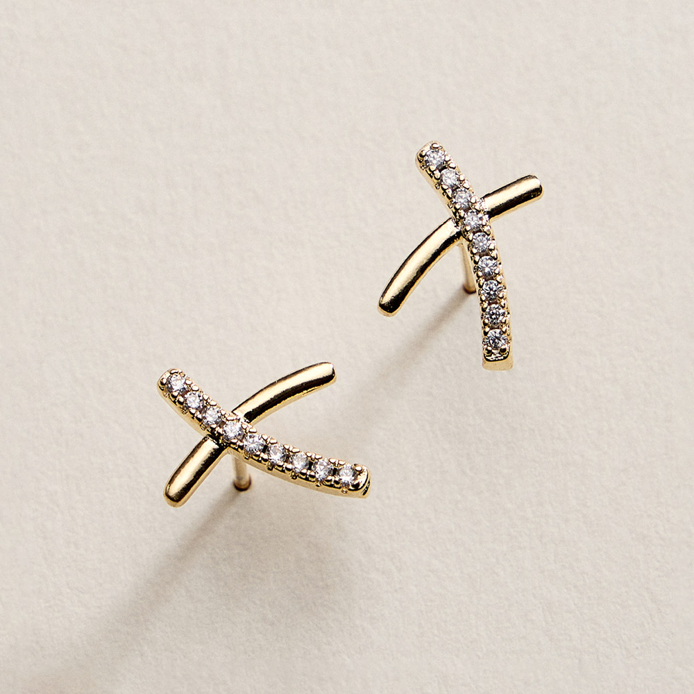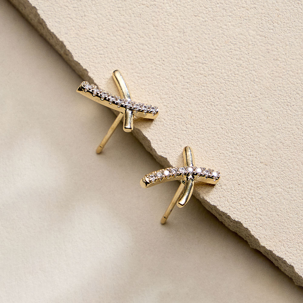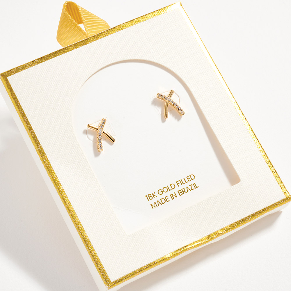 18K Gold Filled CZ Pave Crossover Bar Stud Earrings