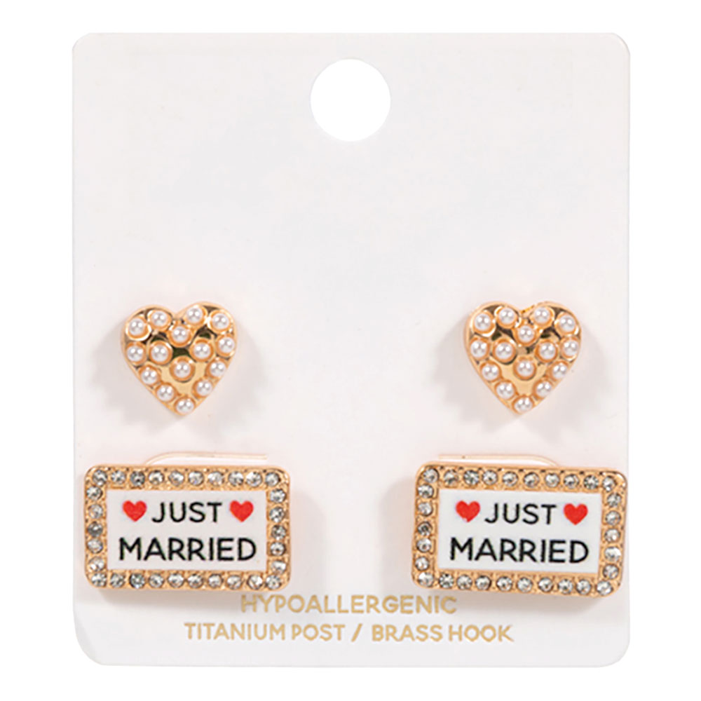 Details • Size : 0.4" - 0.5" L • Titanium Post Back • Wedding-themed stud earrings featuring heart accents and “Just Married” sign designs for a playful yet elegant bridal look. Ideal for brides, bachelorette parties, bridal showers, honeymoon outfits, and wedding photo moments. A charming accessory that adds celebration, romance, and gift-ready appeal to bridal and event-focused collections. • Hypoallergenic • Lead and Nickel Compliant