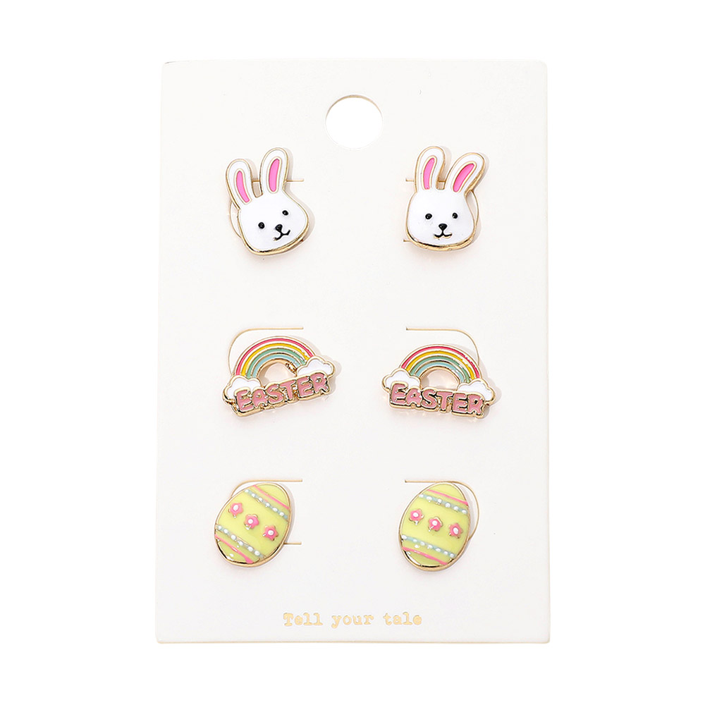 • Celebrate seasonal style with this three-pair stud earring set featuring bunny faces, rainbow accents, and decorative egg designs. Mix and match the playful motifs for everyday outfits, festive looks, or thoughtful gifting that adds cheerful charm.
