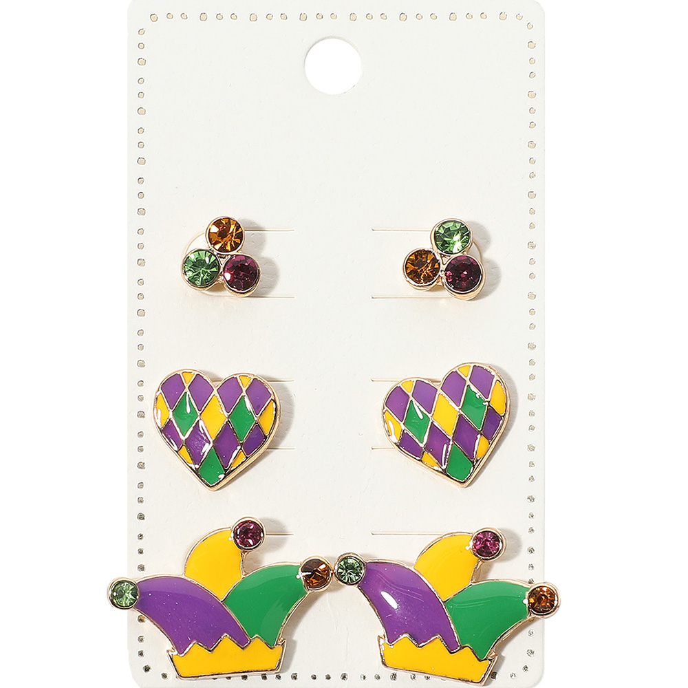 3Pairs - Enamel Mardi Gras Heart Hat Stud Earring Set