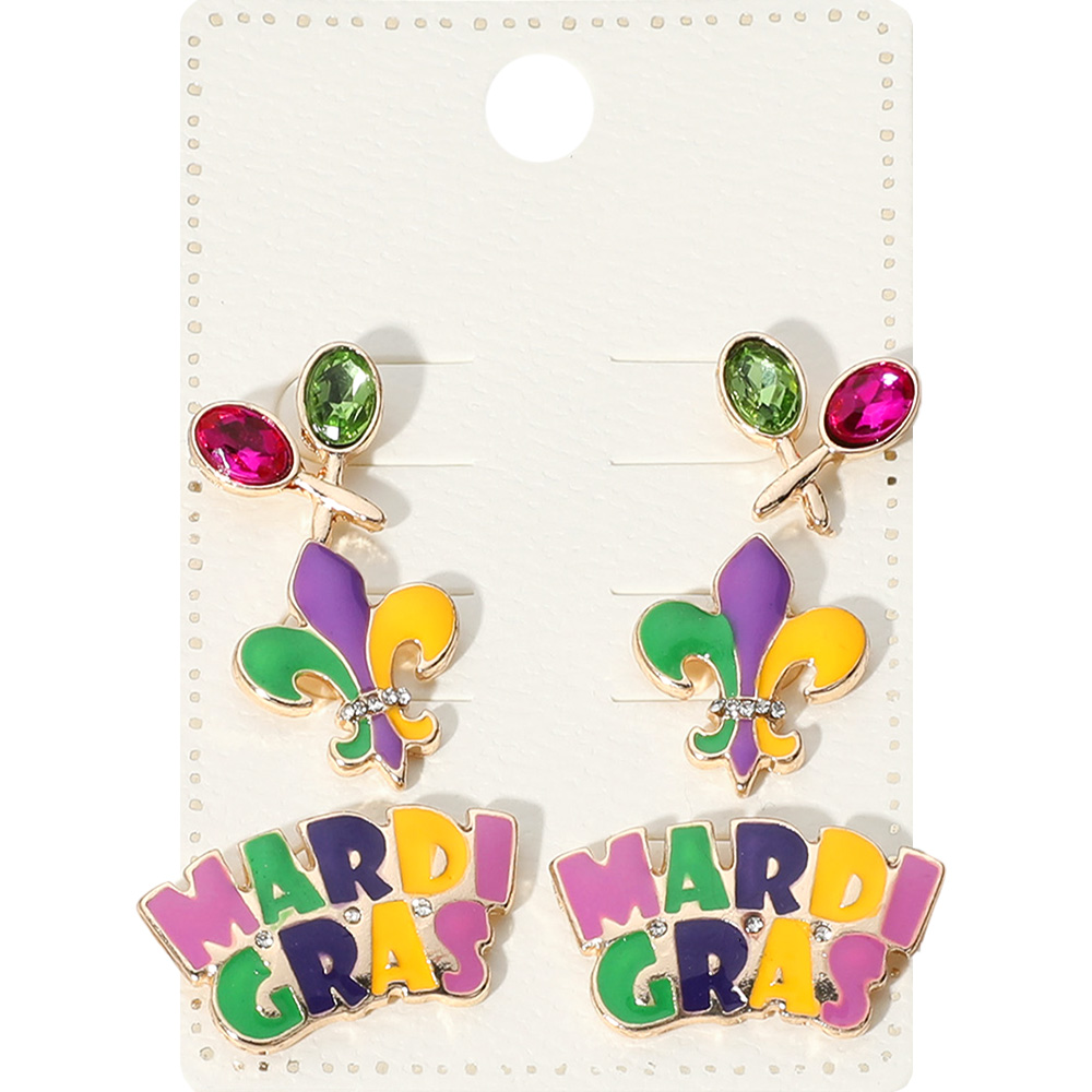 3Pairs - Enamel MARDI GRAS Message Fleur de Lis Stud Earrings Set
