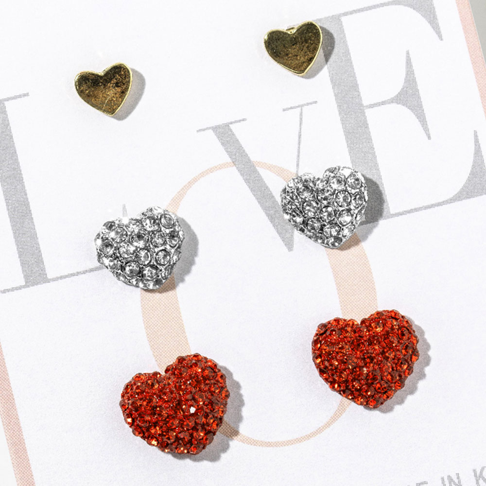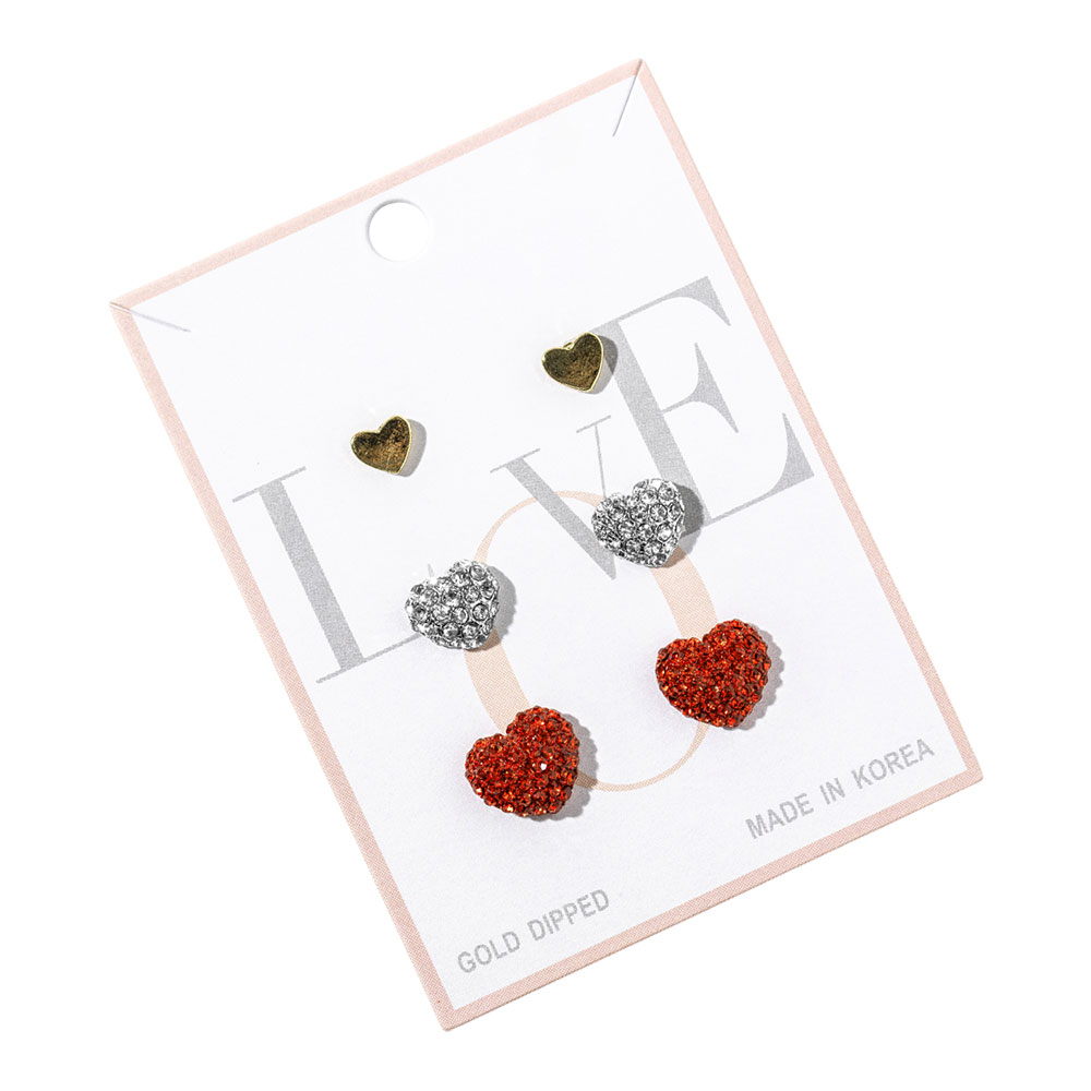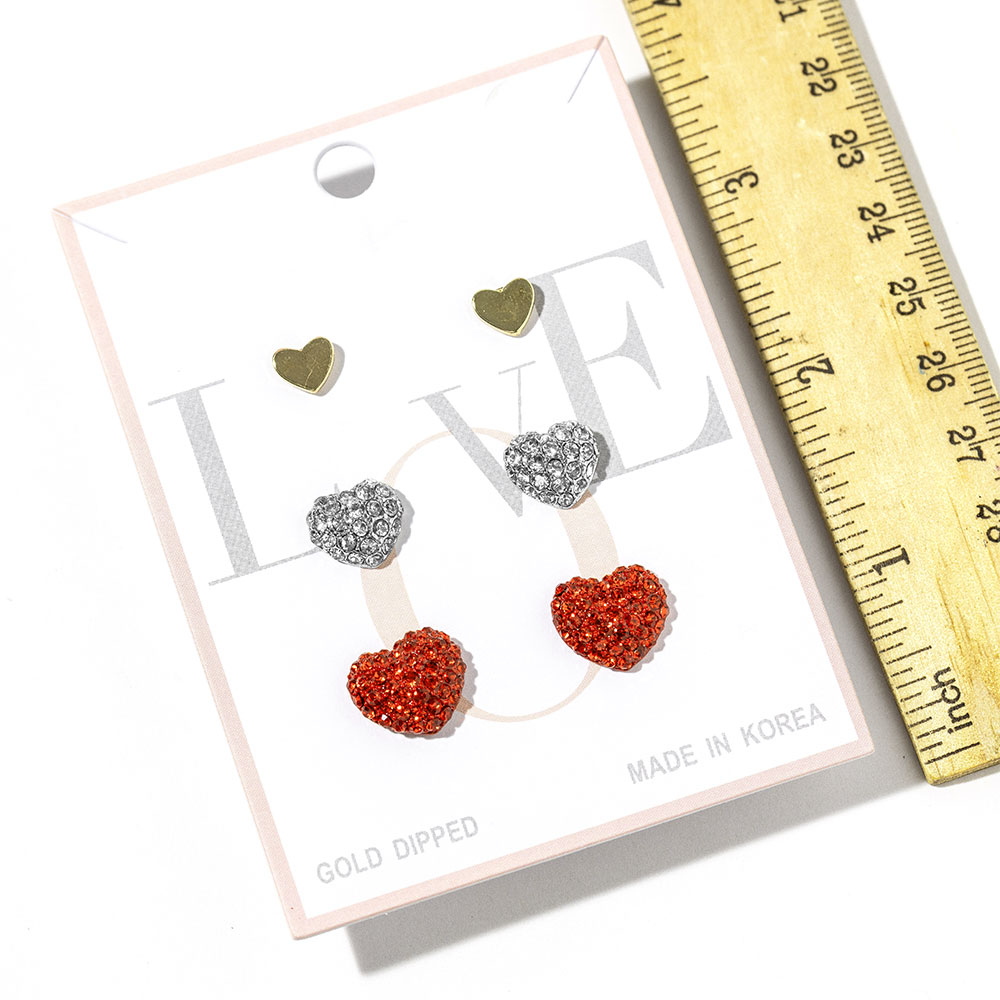 Details • Size : 0.2" - 0.6" L • Post Back • Heart stud earring trio set designed for easy mix and match styling. Features three heart-shaped stud designs in coordinated sizes, perfect for multiple piercings or versatile everyday wear. A charming, gift-ready accessory ideal for boutiques, seasonal assortments, and customers seeking playful yet timeless heart jewelry. • Gold Dipped • Lead and Nickel Compliant • Made In Korea