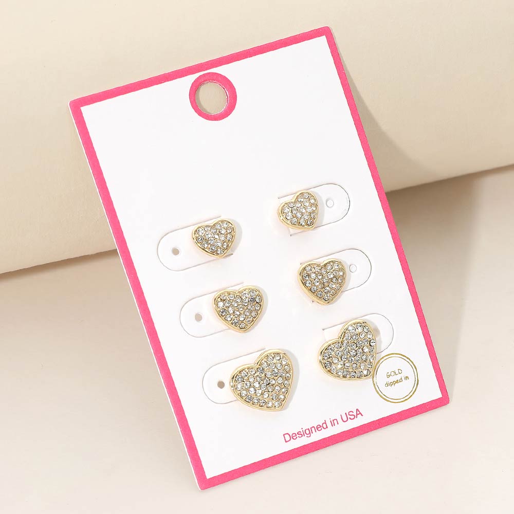 Details • Size : 0.3" - 0.5" L • Post Back • This heart stud earring set features multiple heart-shaped designs accented with shimmering crystal details for a clean, polished look. Ideal for everyday wear, gifting, or boutique assortments, these versatile stud earrings allow easy mixing and matching to complement casual outfits, dressy styles, and special occasion looks. • Lead and Nickel Compliant • Gold Dipped