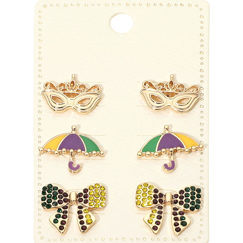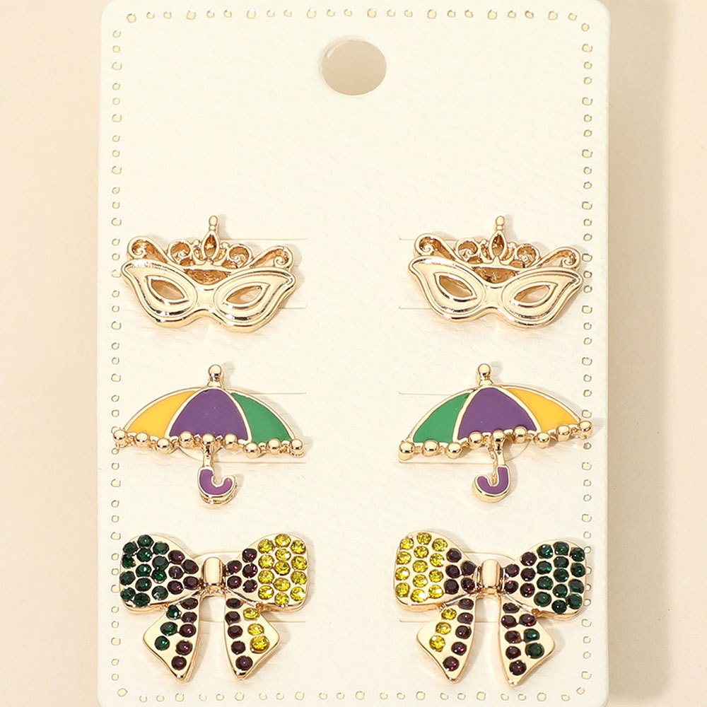 3Pairs - Mardi Gras Mask Umbrella Bow Stud Earring Set
