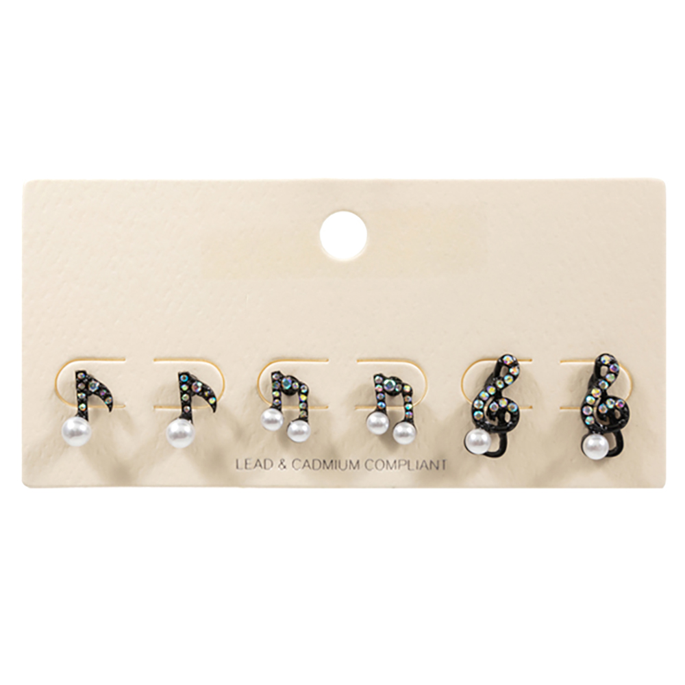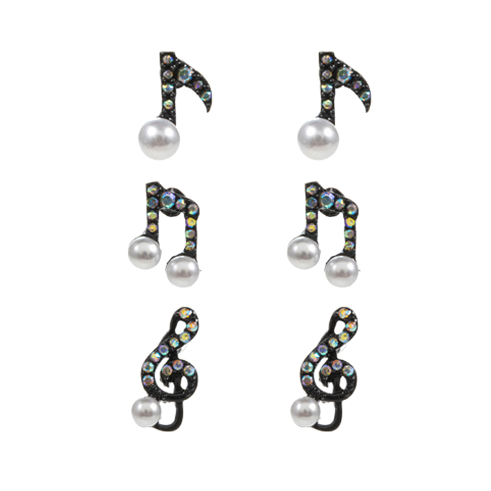 3PAIRS - Rhinestone Paved Pearl Pointed Music Note Stud Earring Set