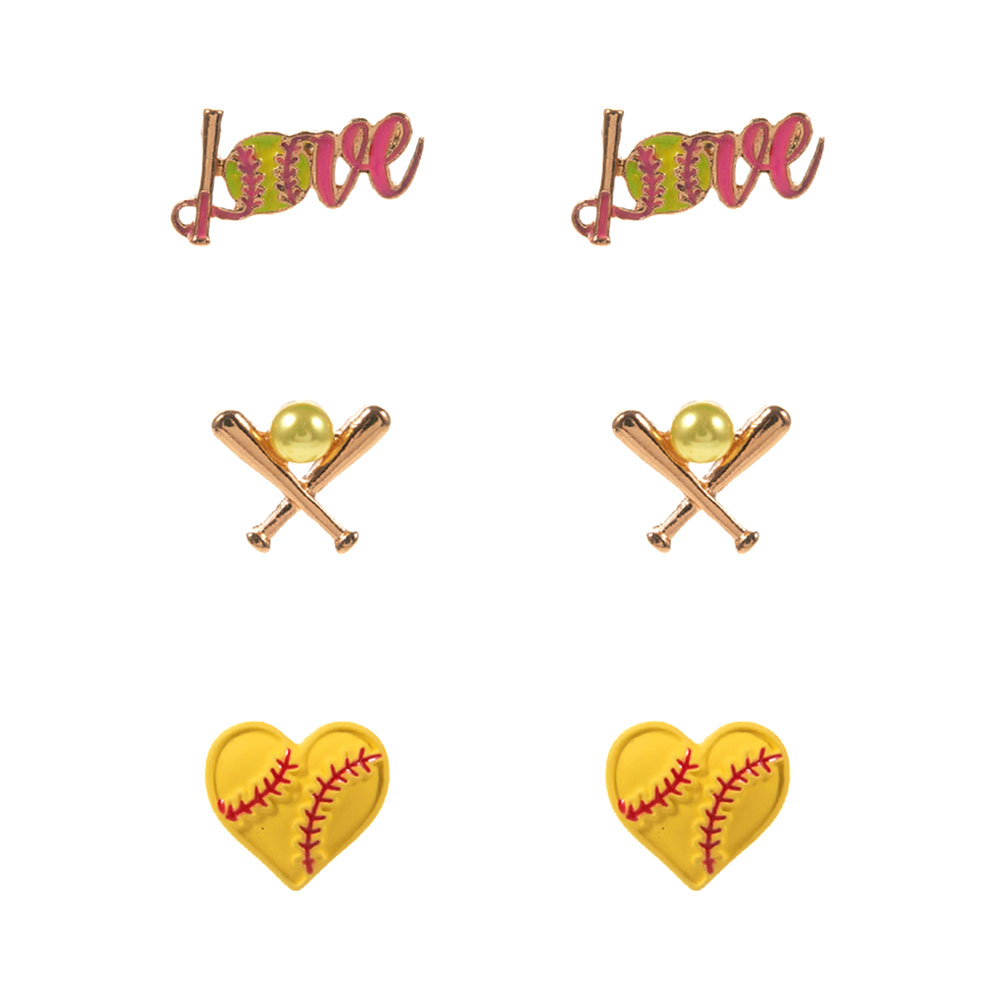 Details • Size : 0.4" L • Titanium Post Back • Sporty stud earring set featuring playful softball-inspired designs including hearts, bats, and script accents for easy mix-and-match styling. Lightweight and comfortable, these studs are perfect for game day outfits, team events, casual wear, and gifting, making them a fun addition to boutique accessory collections. • Lead and Nickel Compliant • Hypoallergenic