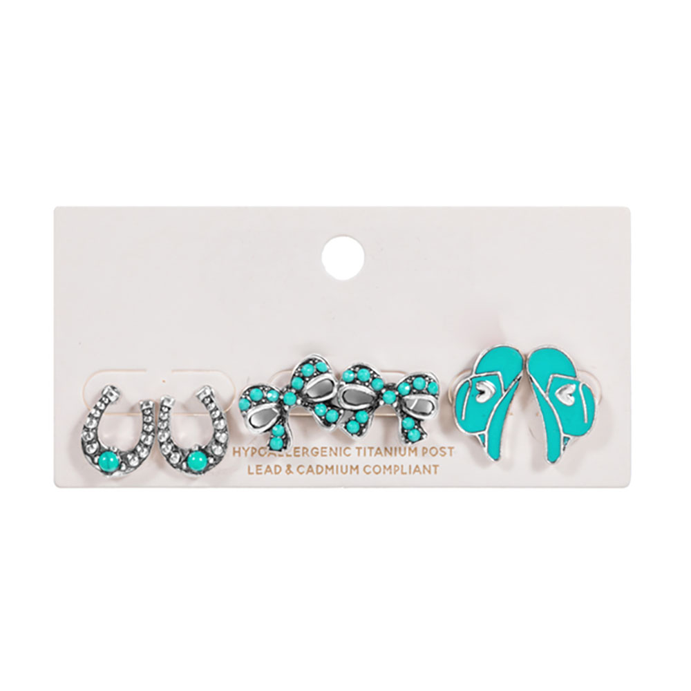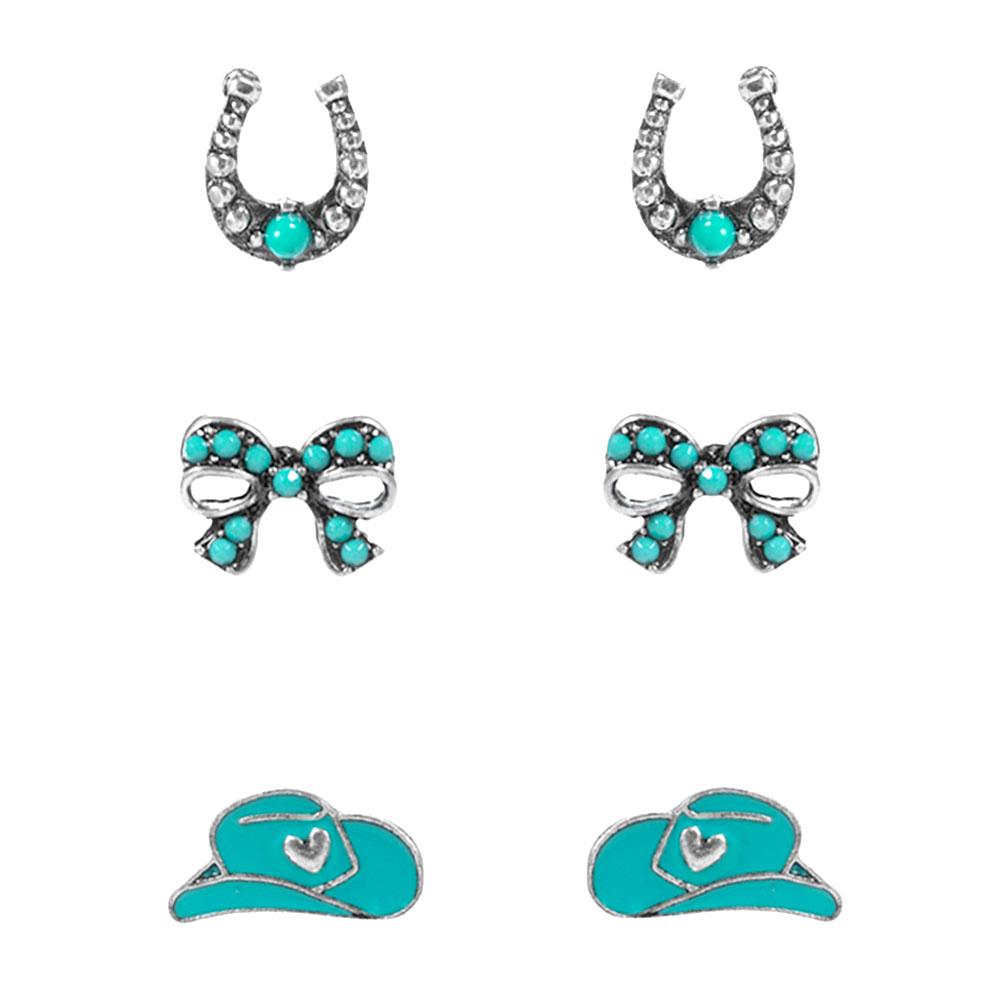Details • Size : 0.5" - 0.7" L • Titanium Post Back • Three-piece western-inspired stud earring set featuring classic motifs for easy mix-and-match styling. Perfect for everyday wear, festivals, and gift giving, offering versatile looks from subtle accents to standout statement combinations in one convenient coordinated collection. • Lead and Nickel Compliant