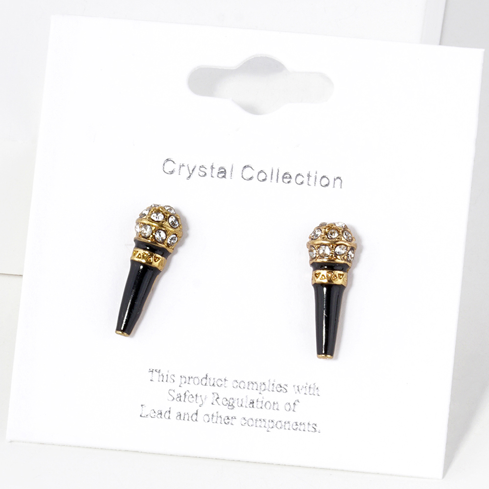 Details • Size : 0.25" X 0.7" • Post Back • Express your love for music with these microphone-shaped stud earrings, detailed with sparkling crystal accents and a sleek finish. A perfect accessory for performers, music fans, or anyone looking to add a unique and playful edge to their everyday jewelry collection. • Lead and Nickel Compliant