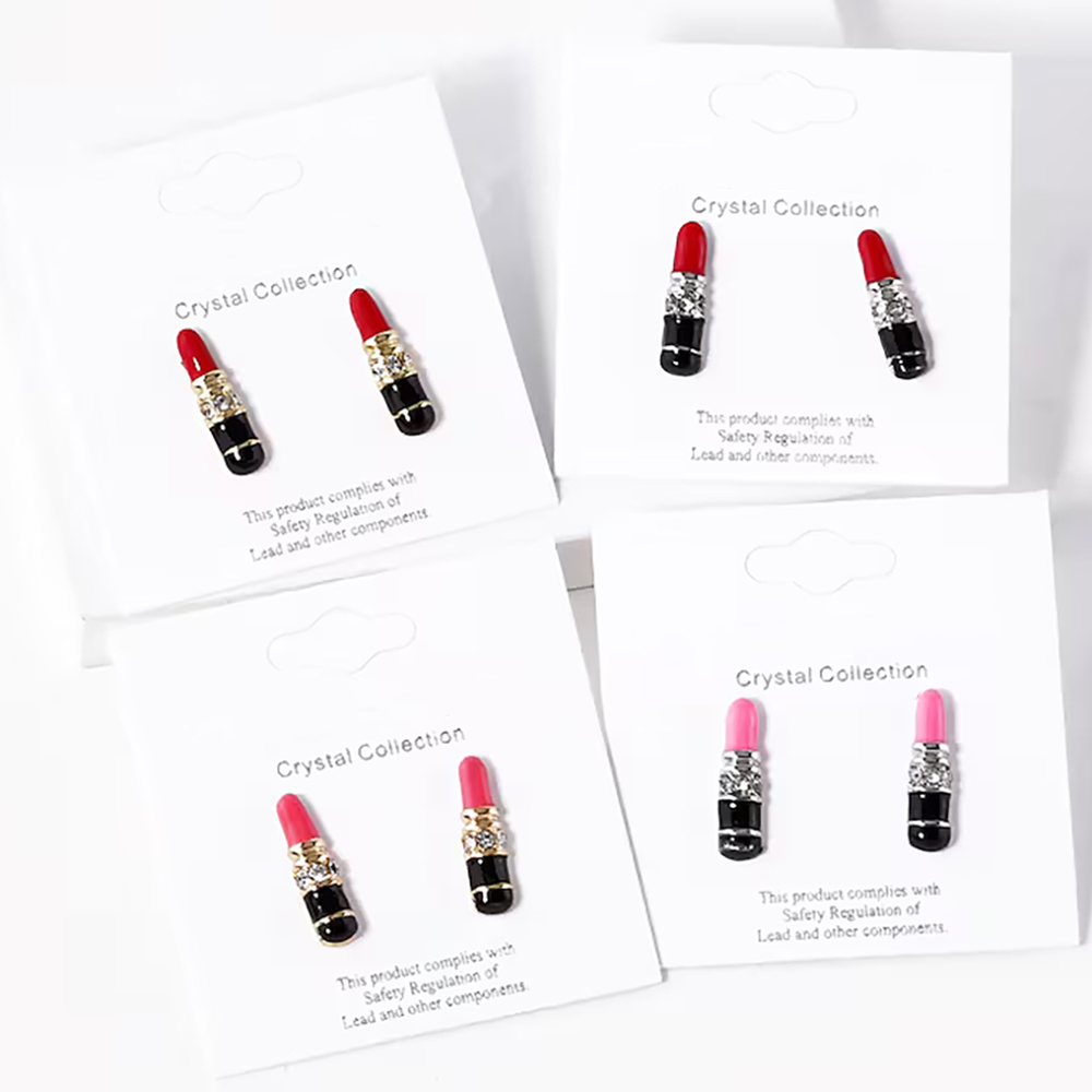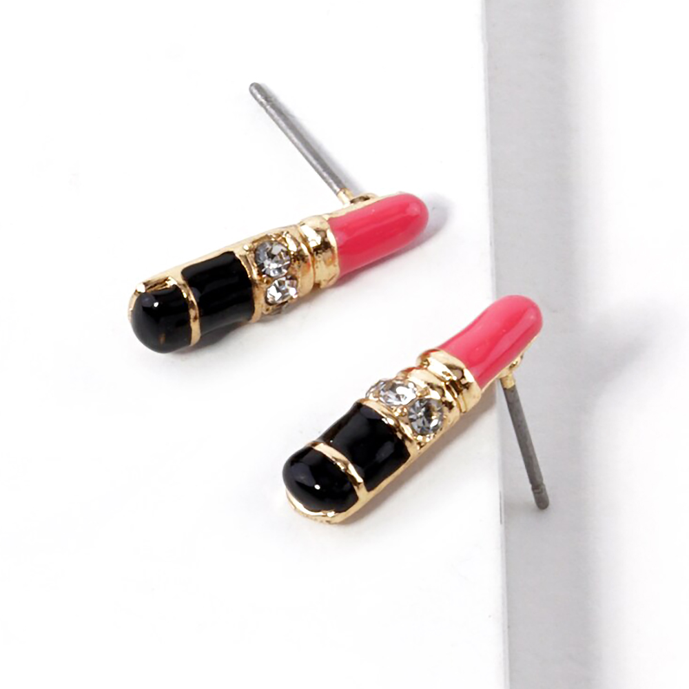 Details • Size : 0.2" X 0.7" • Post Back • Add a playful touch to your outfit with these lipstick-themed stud earrings featuring sparkling rhinestone accents and a sleek, fashion-forward design. Perfect for beauty lovers or as a quirky gift, these earrings bring charm and personality to any accessory collection. • Lead and Nickel Compliant