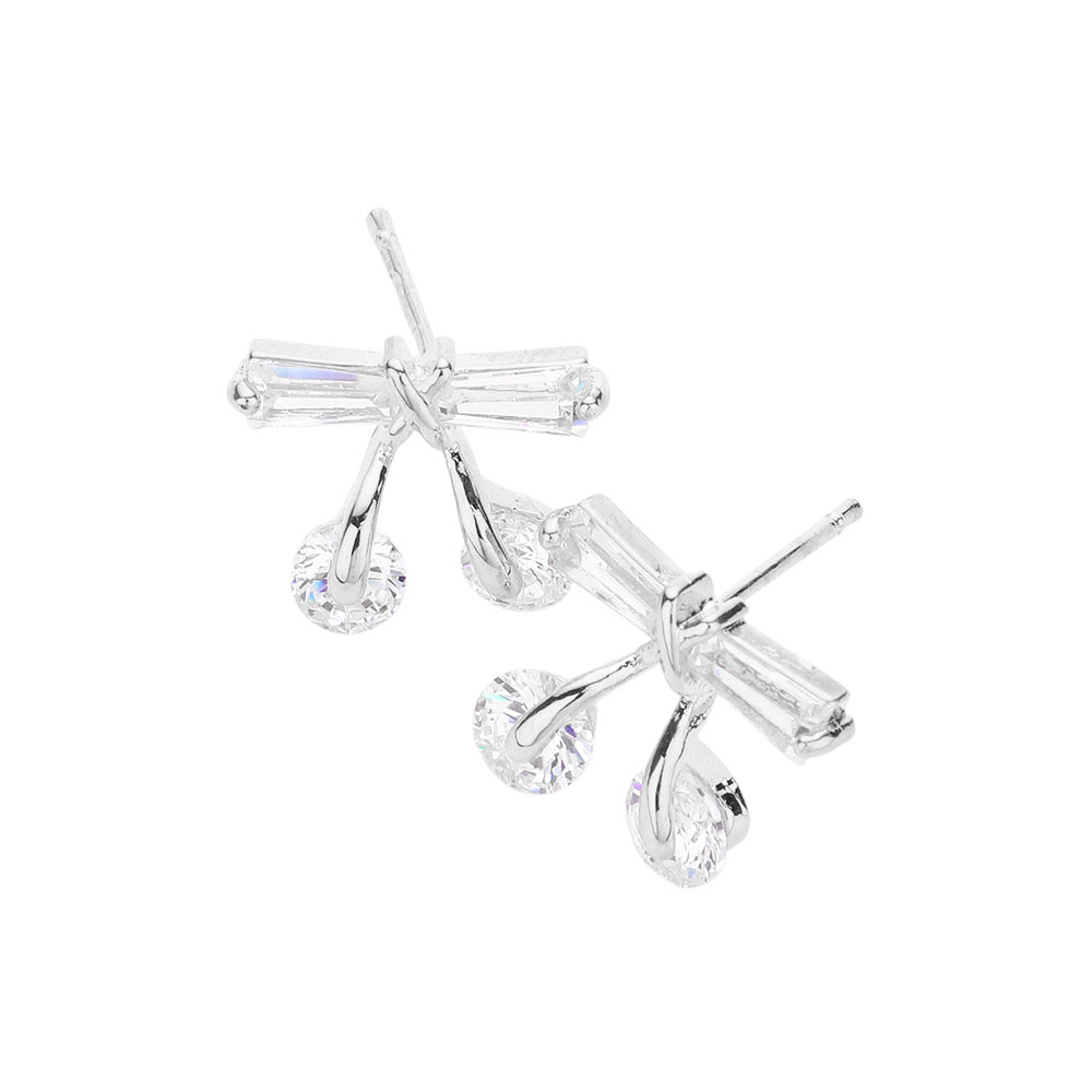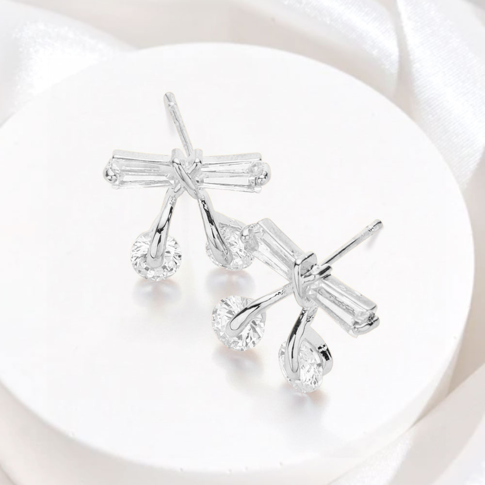 Details • Size : 0.5" X 0.4" • Post Back • Delicate bow-inspired stud earrings accented with sparkling drop details for subtle movement and refined shine. Designed to elevate everyday looks or complement special-occasion outfits, these lightweight studs offer a graceful statement that transitions effortlessly from day wear to evening elegance. • CZ Cubic Zirconia