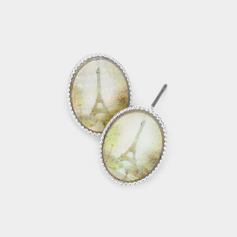 Eiffel Tower Printed Oval Mother of Pearl Stud Earrings