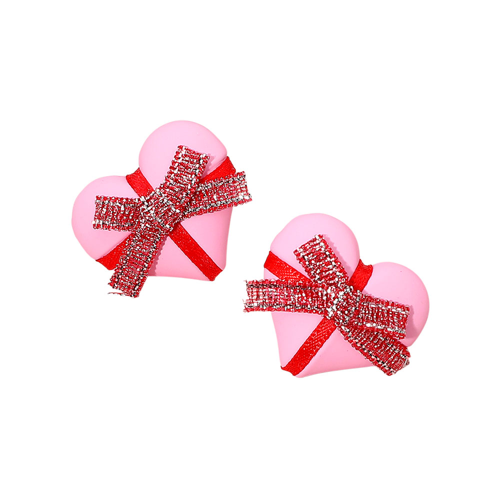 Details • Size : 0.9" X 0.8" • Post Back • Add playful charm to any outfit with these adorable heart-shaped stud earrings, topped with a glittery ribbon design. Perfect for casual looks, themed events, or gifting, they bring a fun and cheerful accent that brightens up your accessory collection with sweet, eye-catching detail. • Lead and Nickel Compliant