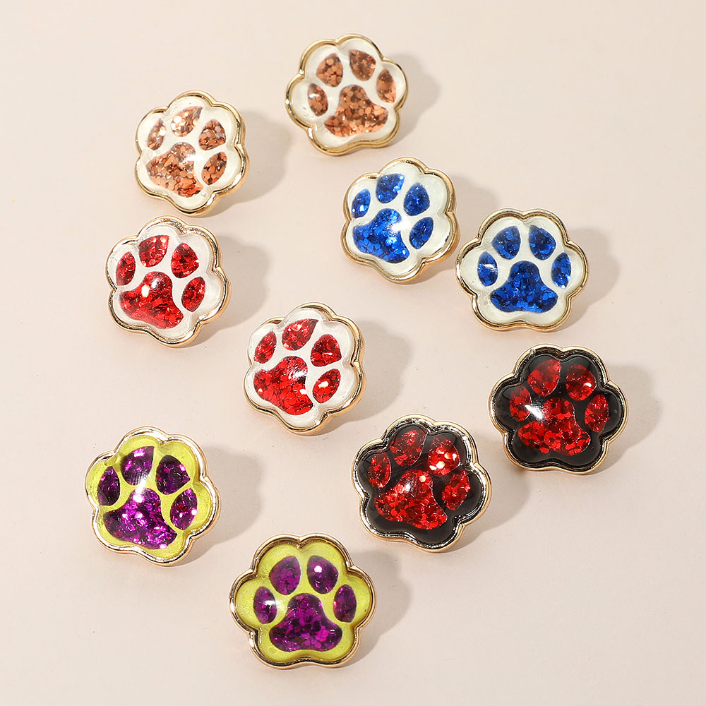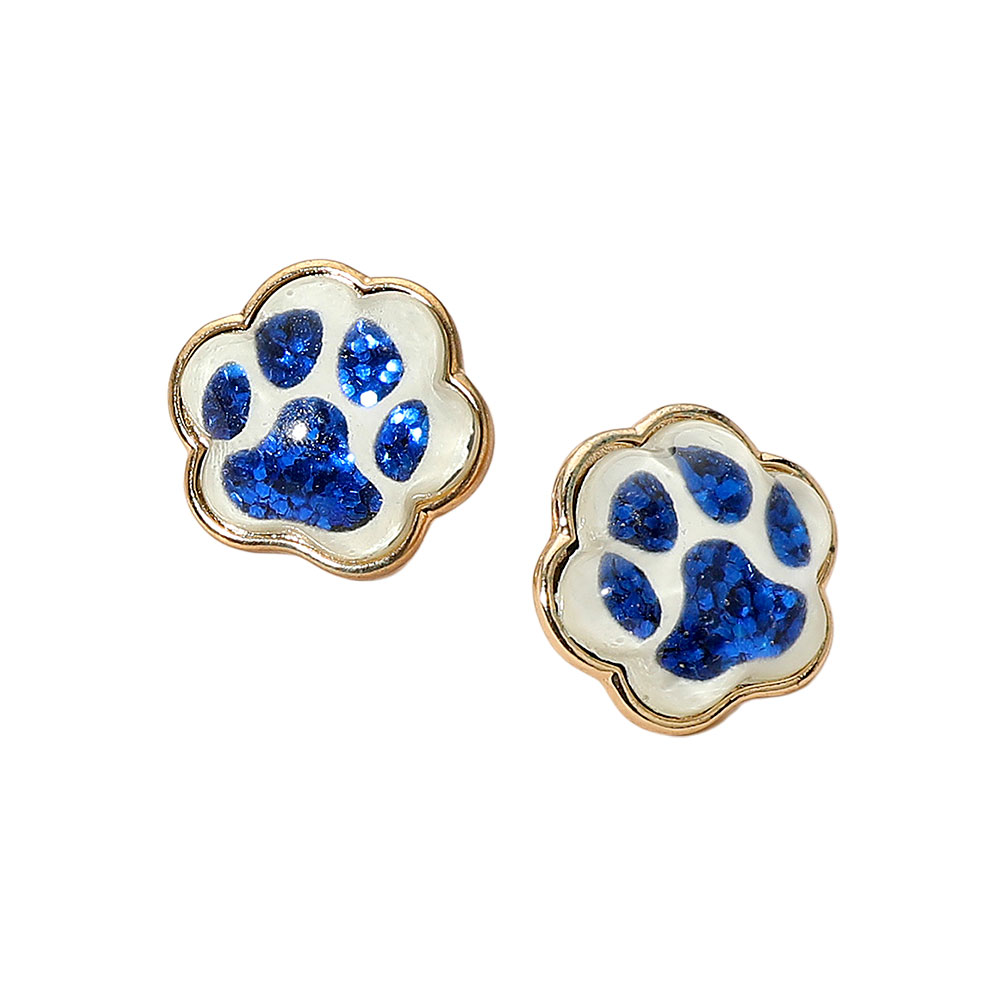 Details • Size : 0.9" X 0.9" • Post Back • Stud earrings designed with glitter-filled paw print accents in multiple color options. Fun and lightweight, these earrings are the perfect way to show team spirit, school pride, or playful style on game day and beyond. • Lead and Nickel Compliant