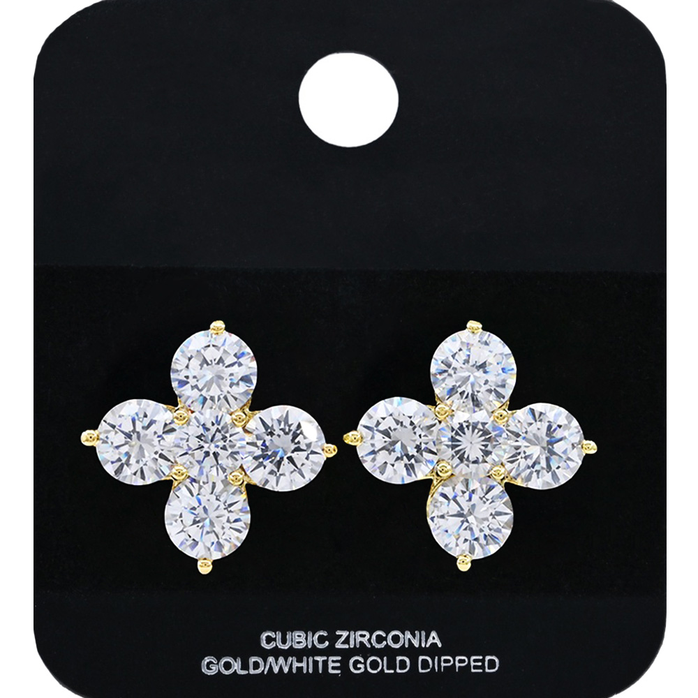 Details • Size : 0.75" X 0.75" • Post Back • Complete your look with clover-shaped cubic zirconia stud earrings. Their symmetrical design and brilliant sparkle add a chic, refined touch, perfect for everyday wear or special events. Gold/white gold dipped for lasting beauty. • CZ Cubic Zirconia • Gold Dipped • Lead and Nickel Compliant