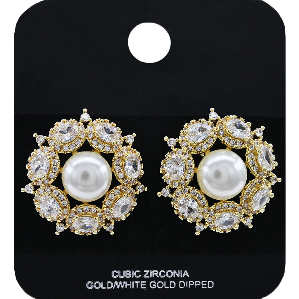 Details • Size : 0.8" X 0.8" • Post Back • Elevate your look with these glamorous pearl and cubic zirconia statement earrings. Featuring a radiant cluster design with sparkling stones and a bold centerpiece, these gold-dipped earrings bring timeless sophistication, making them the perfect accessory for weddings, parties, or formal events. • CZ Cubic Zirconia • Gold Dipped • Lead and Nickel Compliant
